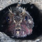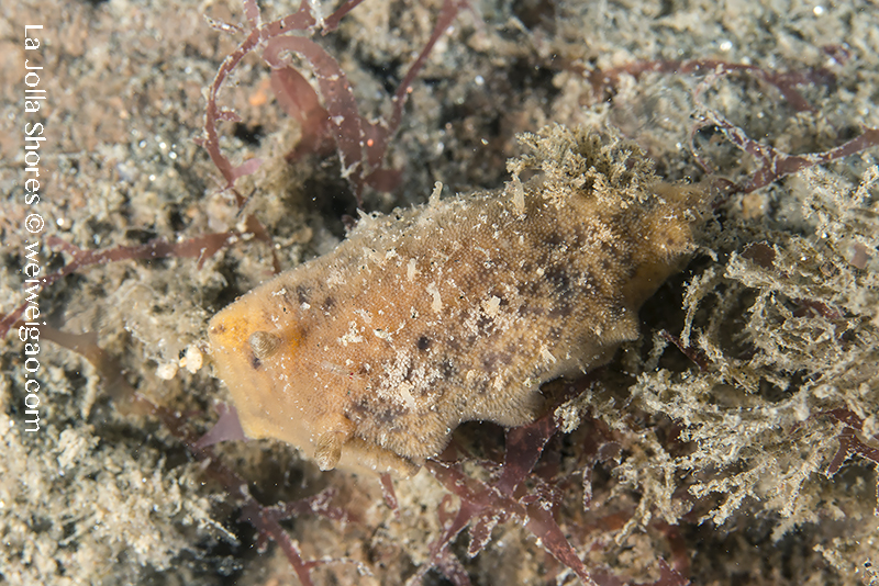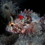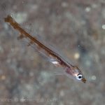As the surf starts to calm down, I headed out to the shores for a night dive. The shallow sandy bottom was fairly surge. The canyon was not bad but the water was a bit murky. I followed the wall to the south. The first interesting encounter was this fish larva – it had a transparent body and I could see the skeleton. The fish was shy, sticking really close to the wall. I finally got a few shots with black background.