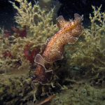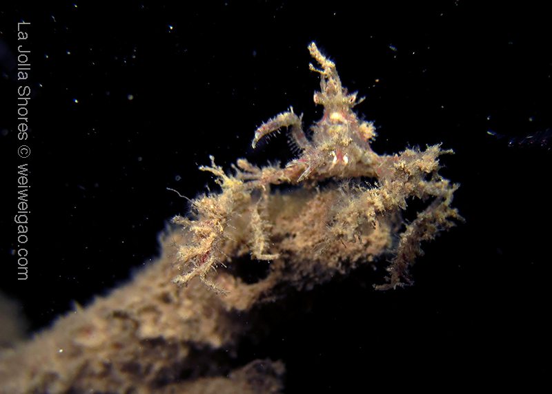 Near the V point, again I saw another baby squid. With the surge, it’s hard to get a good shot. The creature was shy from the light and kept swimming toward the surface.