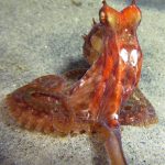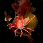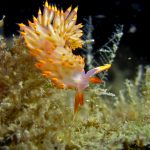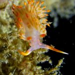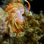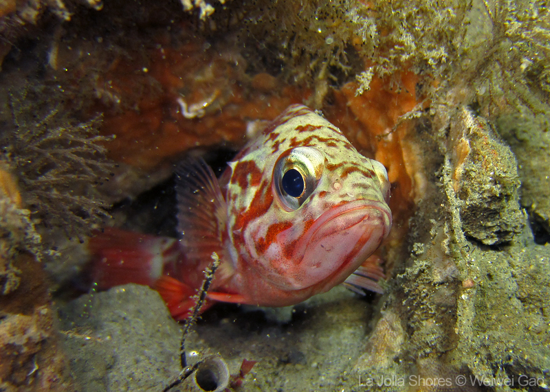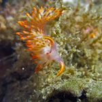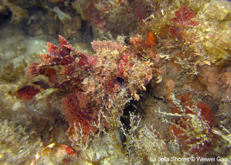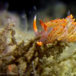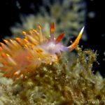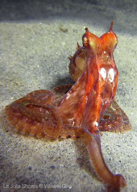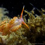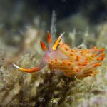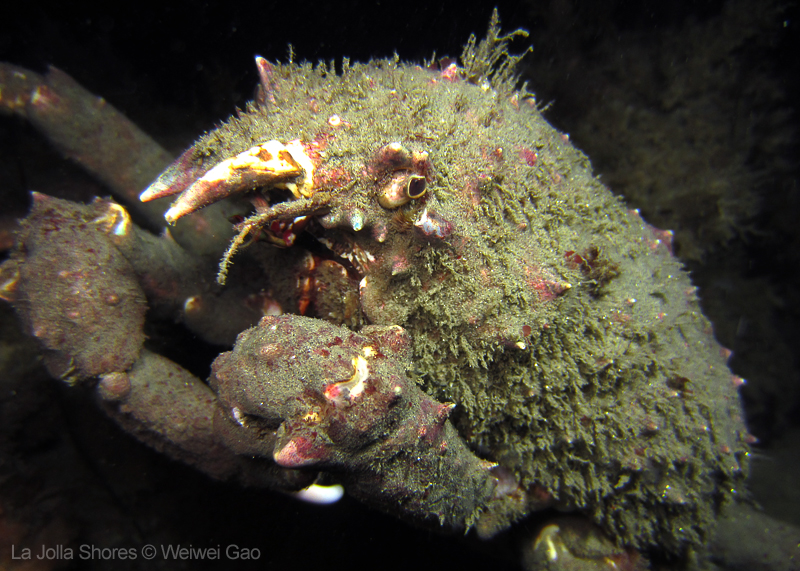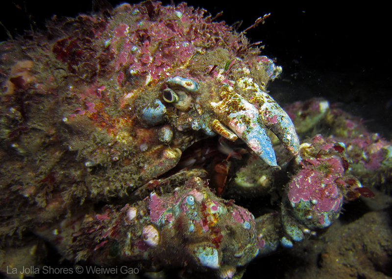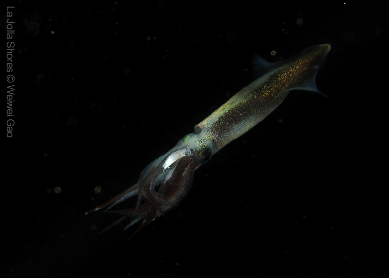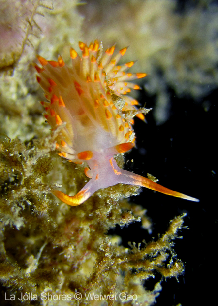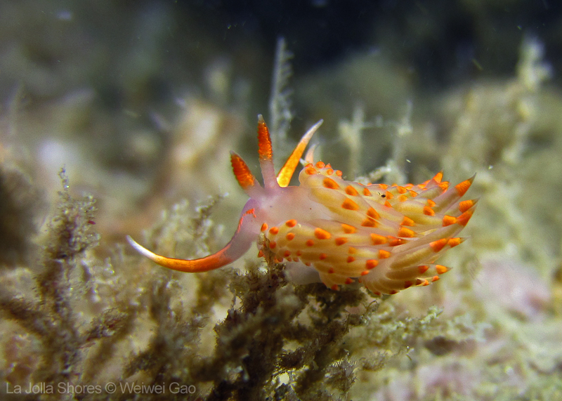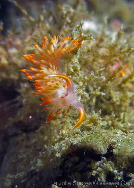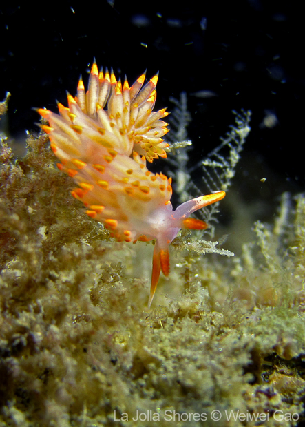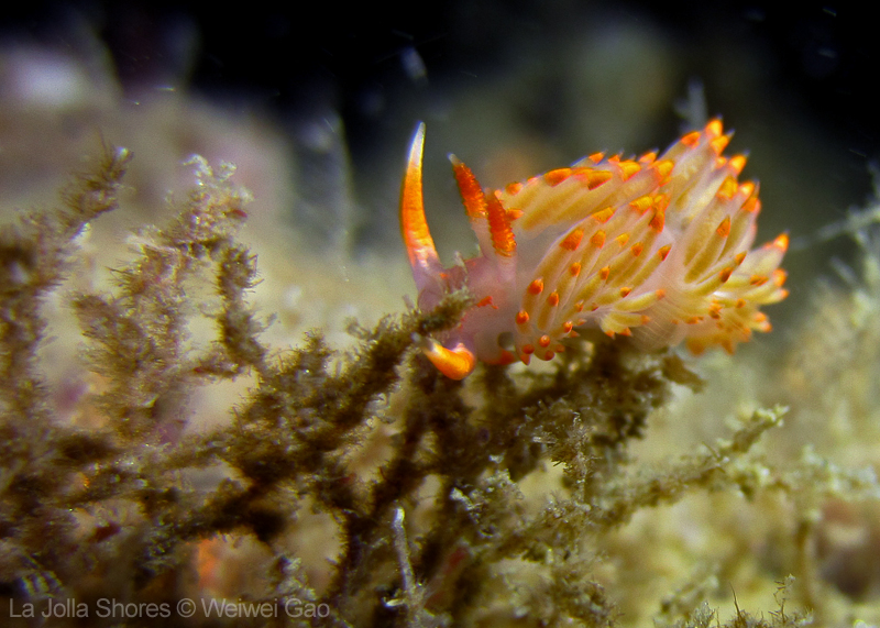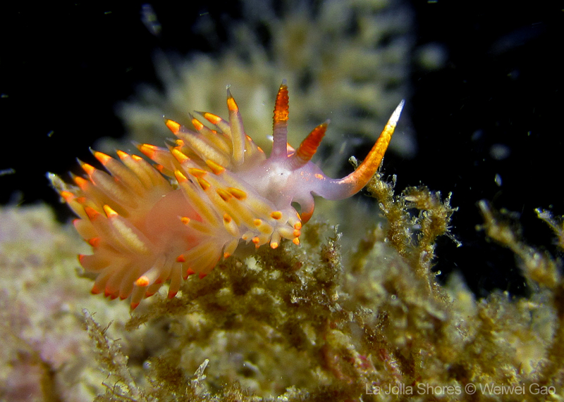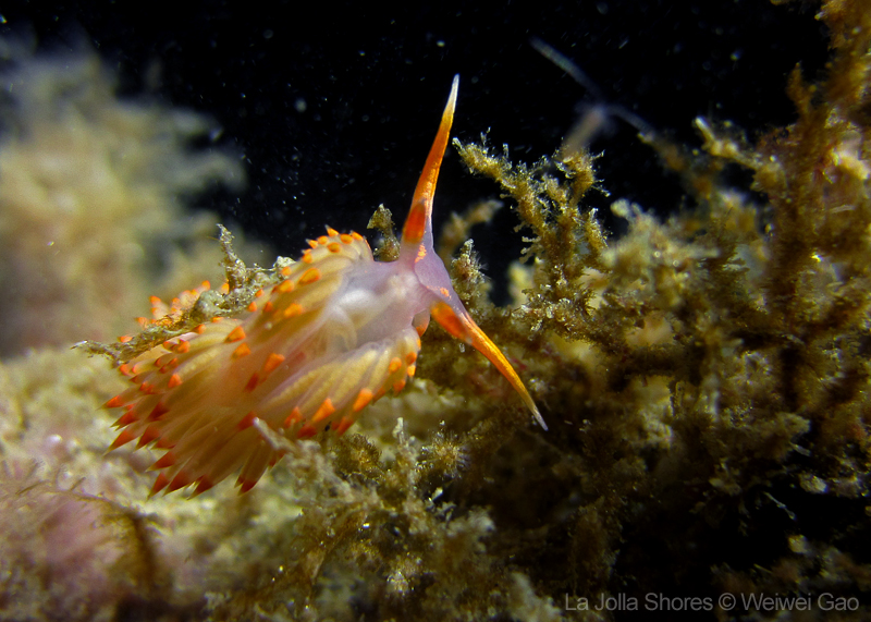 The swell was retreating and the wave became smaller; however, it was still very surgy, particularly in the shallow. Right after I dropped down and pointed my light ahead, an adult horn shark was right in front of my face – we both were scared and he took off right away. I headed north to the V-point. It was pretty quiet. Passed the point all the way to the grass slope to check out the squids. I only saw one and it looked very frail. Turned back and saw the family of Stearn’s Aeolid – two of them were out. So I spent quite sometime there.