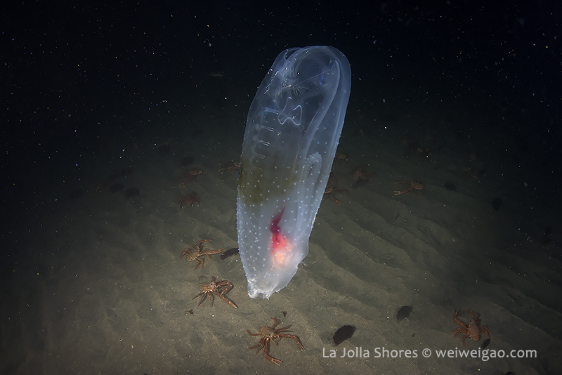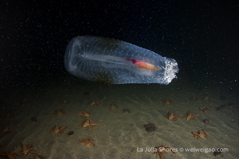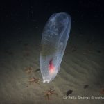 I followed for a while. Back to the shallow a lifeless tunicate was drifting, pretty cool. I guess it’s grunion run tonight – a few sea lions were playing in about 5 ft water and tons of birds gathered in front of the V street. A cool dive.