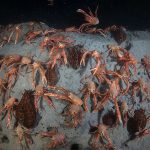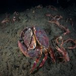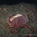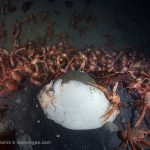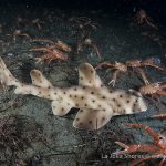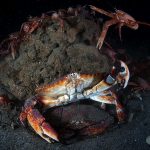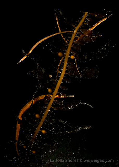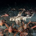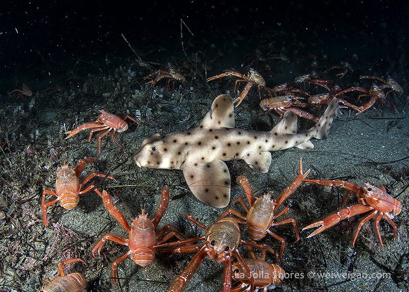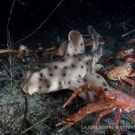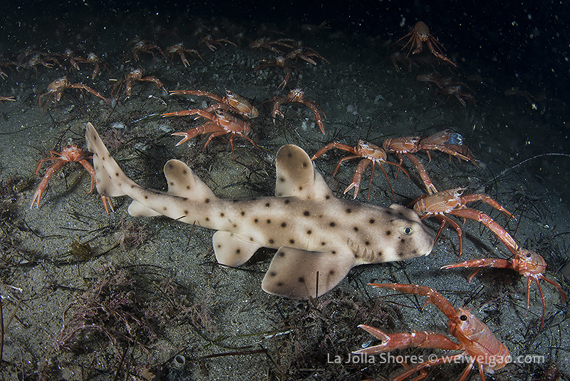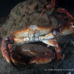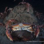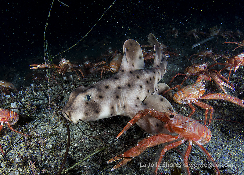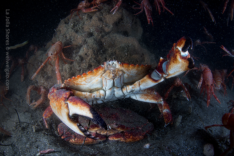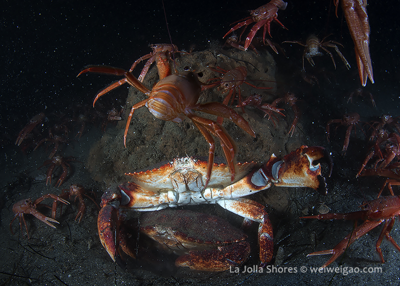 There was a small gathering of the sea hares but once my light shined on them, they were bombed badly by the tuna crabs.