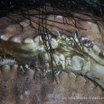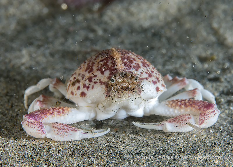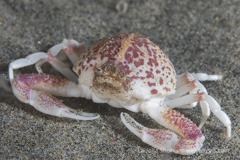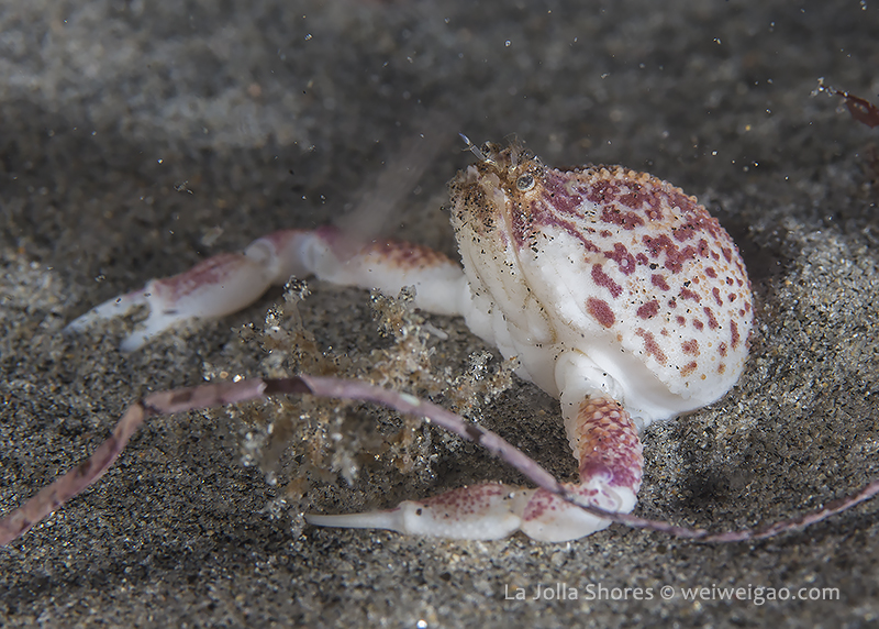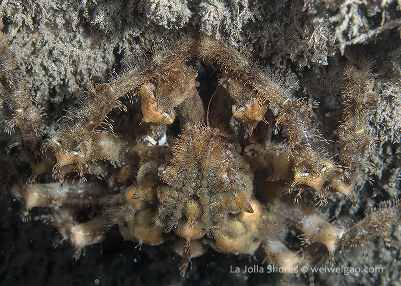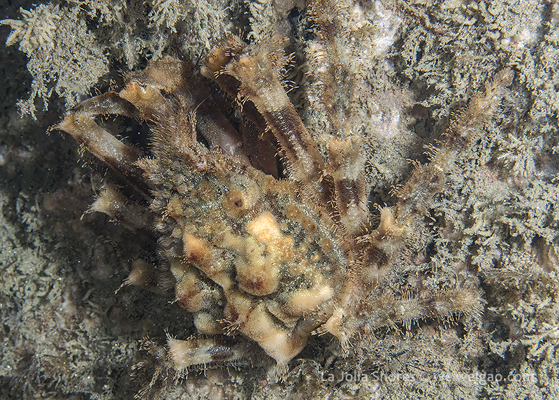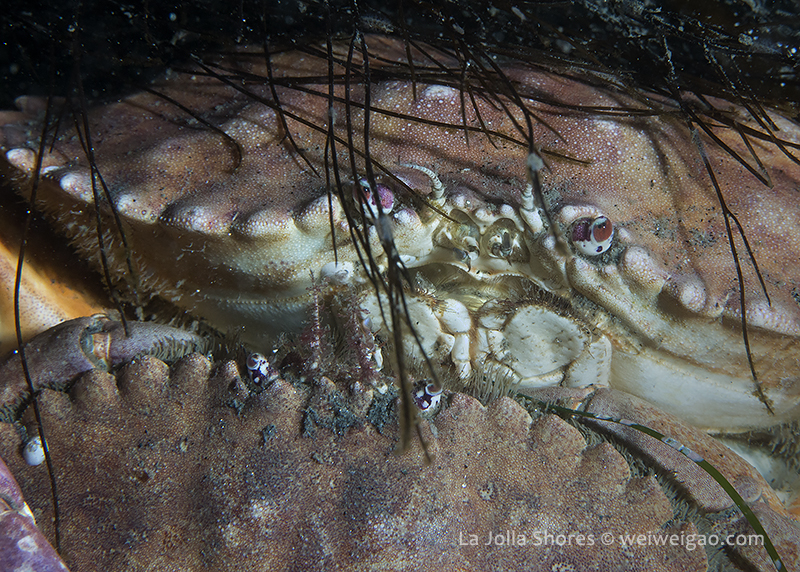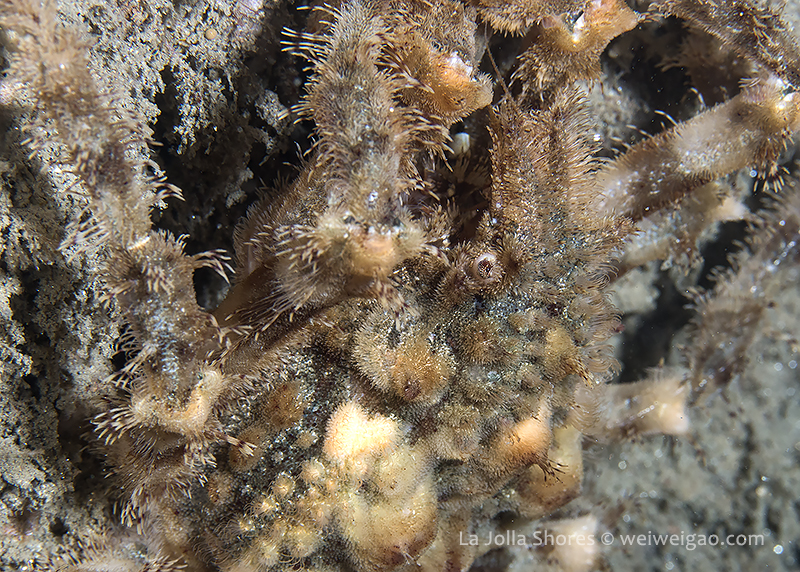 Night at La Jolla Shores – beautiful sunset at the shores. The surf became smaller tonight and the surface looked beautiful with clear emerald water. I dropped down right at the canyon. It was surgy and the vis about the same ~15 ft, but the temperature dropped to 52F throughout the dive. Tonight for the first time in a long time I switched to a macrol lens and set up my rig for videos. The cool encounter was a strange looking crab, which I don’t recognize.