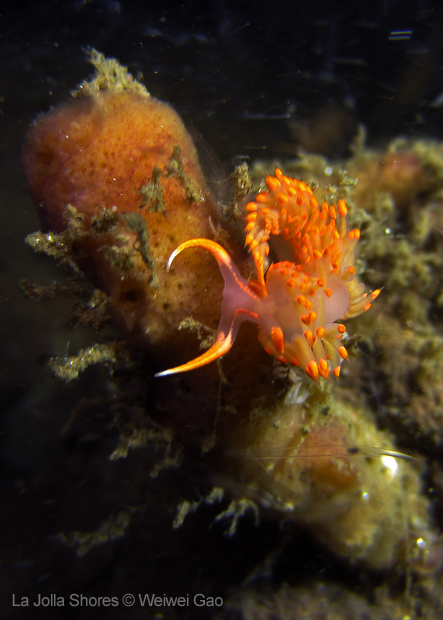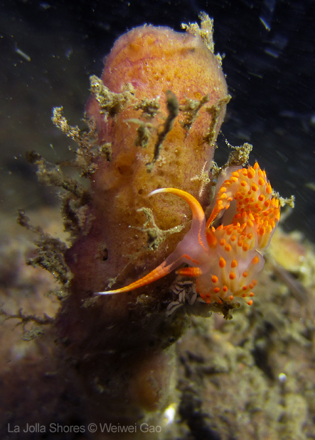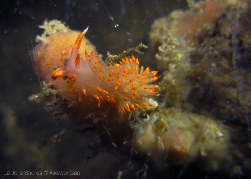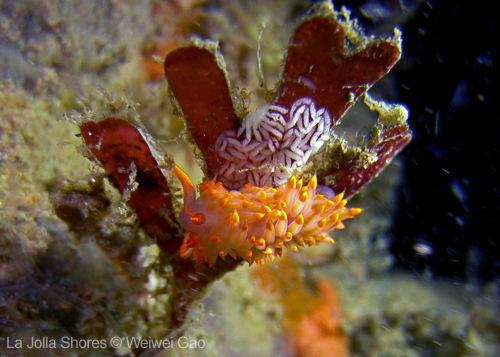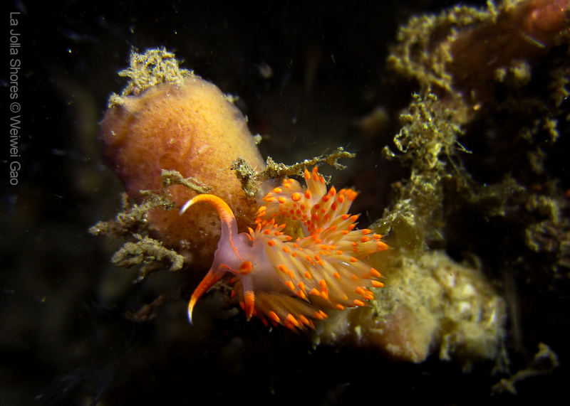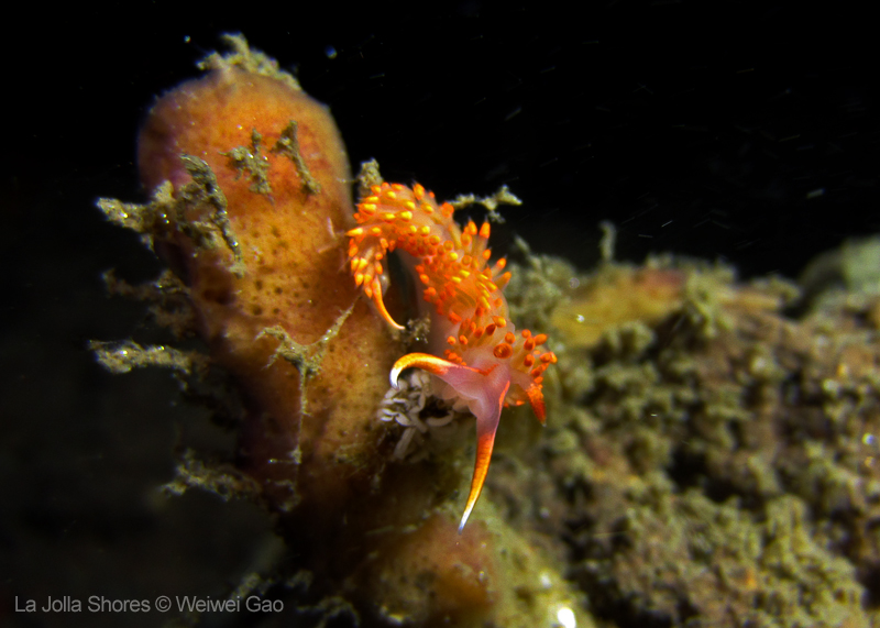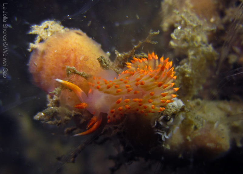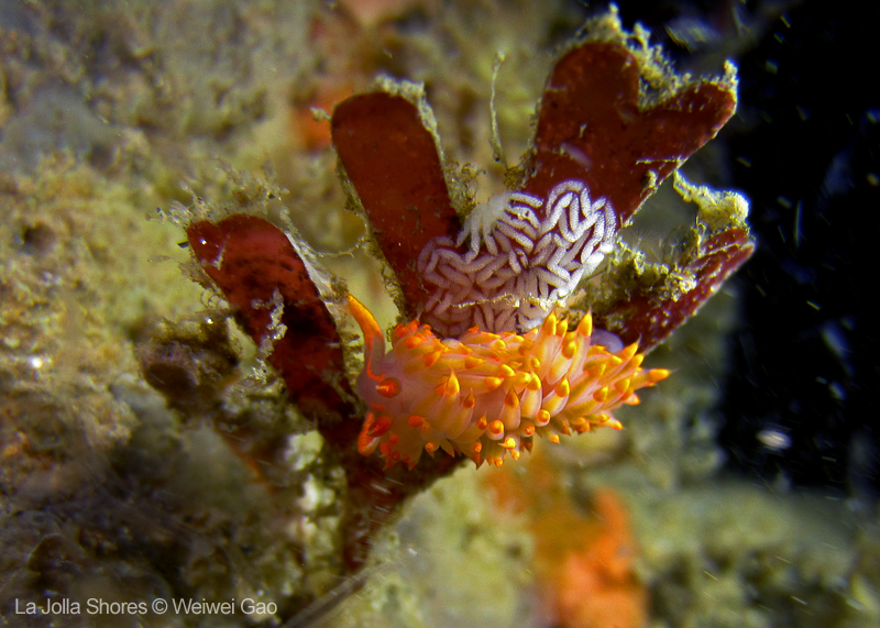 There was a surge at the canyon and the swing made it difficult to take pictures. I kicked fast to the Vallecitos Point. The wolf eel was in his home but I didn’t see any octopus. Then I spotted a Stearn’s Aeolid, which was busy laying eggs under a piece of kelp.