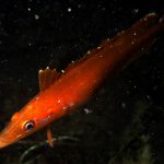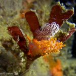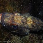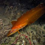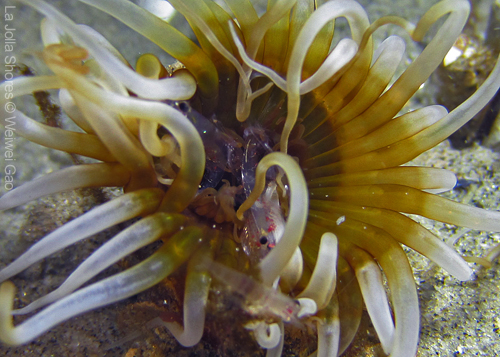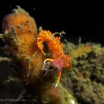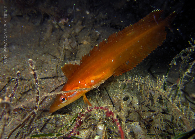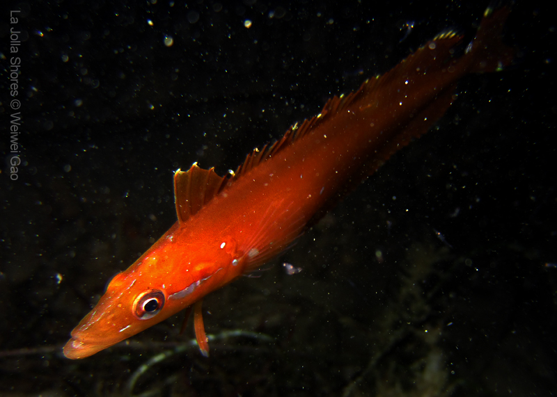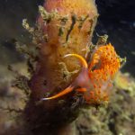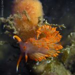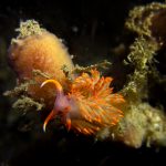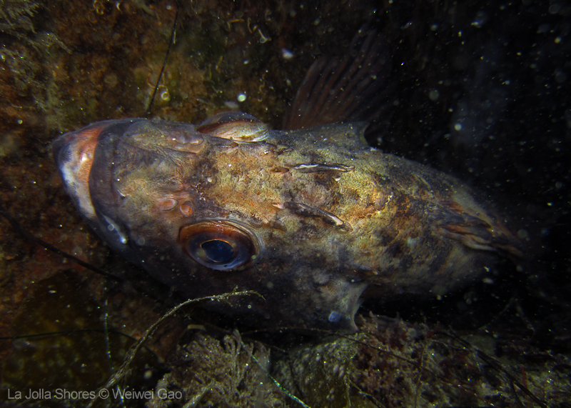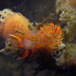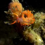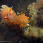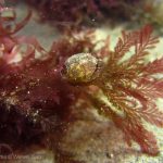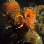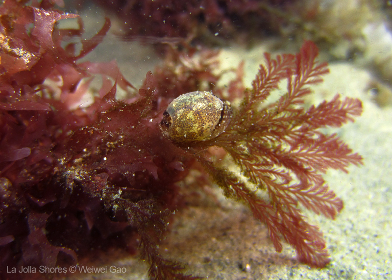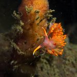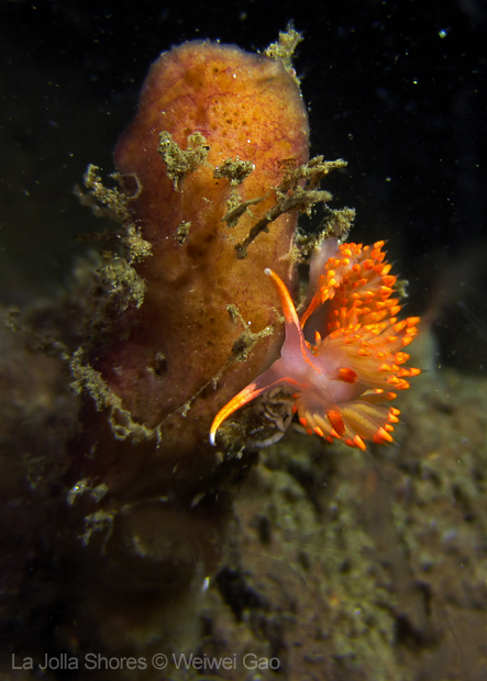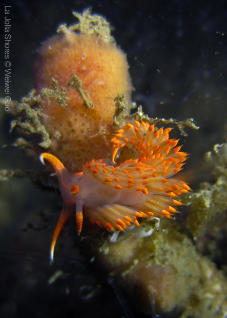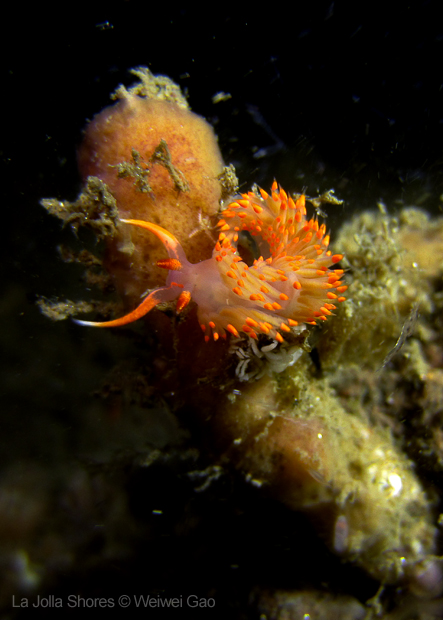 There was a surge at the canyon and the swing made it difficult to take pictures. I kicked fast to the Vallecitos Point. The wolf eel was in his home but I didn’t see any octopus. Then I spotted a Stearn’s Aeolid, which was busy laying eggs under a piece of kelp.