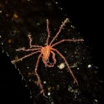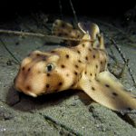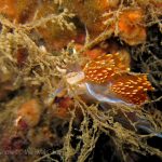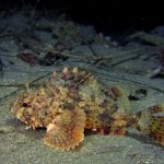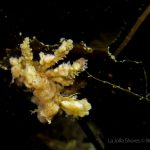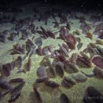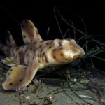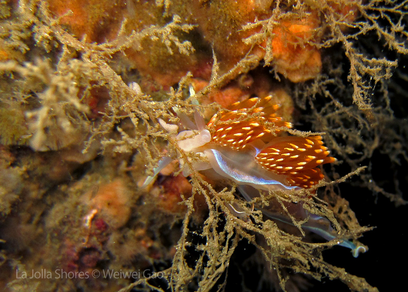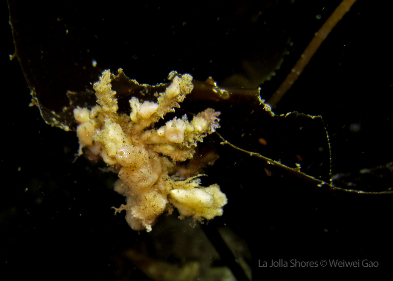 The visibility was still very good. Although the kelp was sporadic, with a careful look, it was not difficult to spot a few kelp crabs on each of them. To my surprise, the kind of little crabs came with different styles and the camouflage they put on made them a very funny looking. Looking toward the canyon, I could see the shrimps were all out and under my dive light their eyes were glowing. On the ledge, lobsters were out too. They knew they were going to be safe so they were shy with a spot light shinning right on them. But surprisingly, there were many stingrays lying on the top of the wall. You got to see the stingrays most of the time on the shallow sandy bottom. I was trying to figure out if they were waiting for certain prayers but had no clues in the end. Baby horn sharks were also not difficult to find, and I am sure I saw three of them. I had been eager to see a nudibranch and eventually found one on the pipe.
