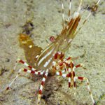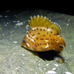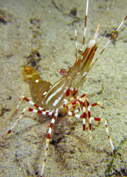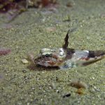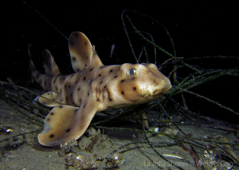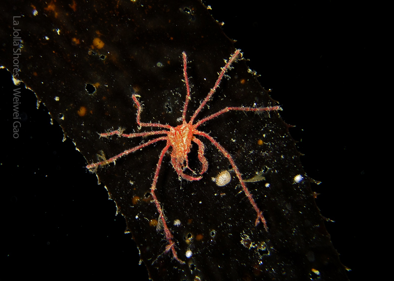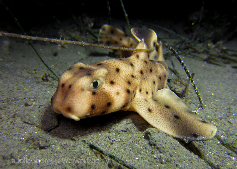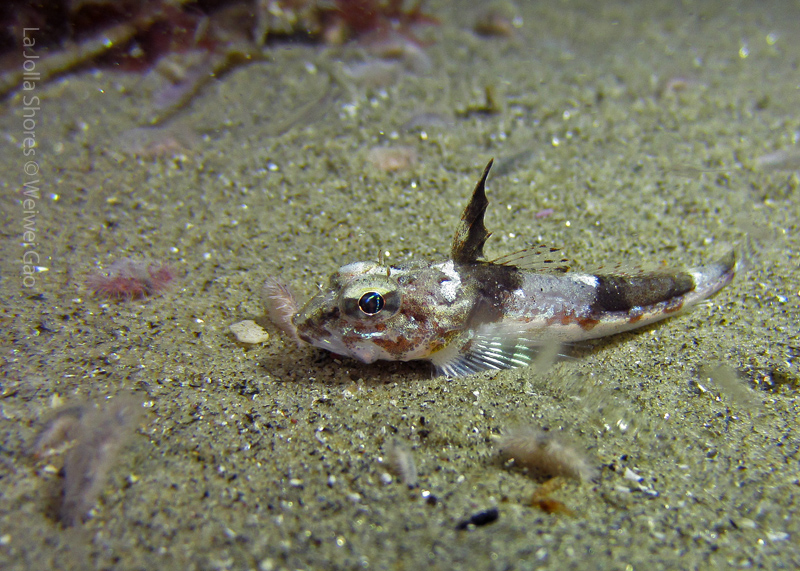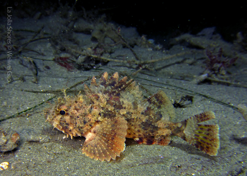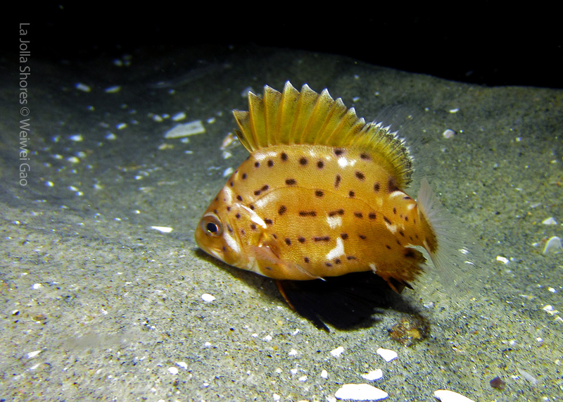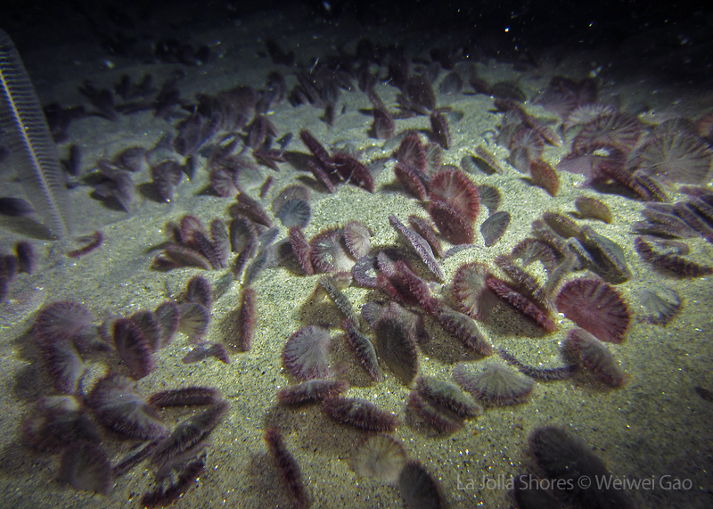 Two-thirds into my dive, I turned back and started to swim back to the shores. Once I reached the sandy slope, I was amazing by the sand dollar field, which was filled with a vast field of sand dollars. Amazingly, with the crowded sand dollars came all kinds of other creatures. The California tonguefish was cute and the crabs and shrimps were just about everywhere. Then I spotted this beautiful fish with a unique shape and strange large black fins. It was excited to see the krill attracted by my dive light and started a beautiful dancing.