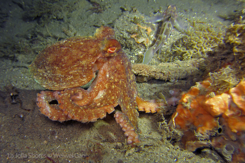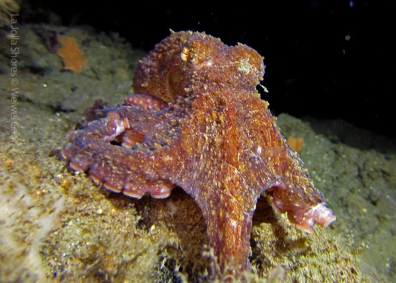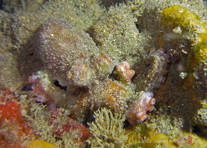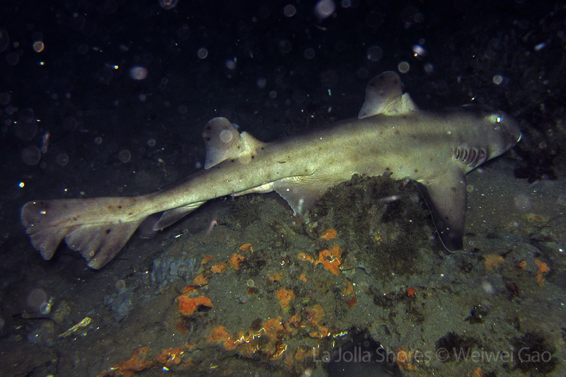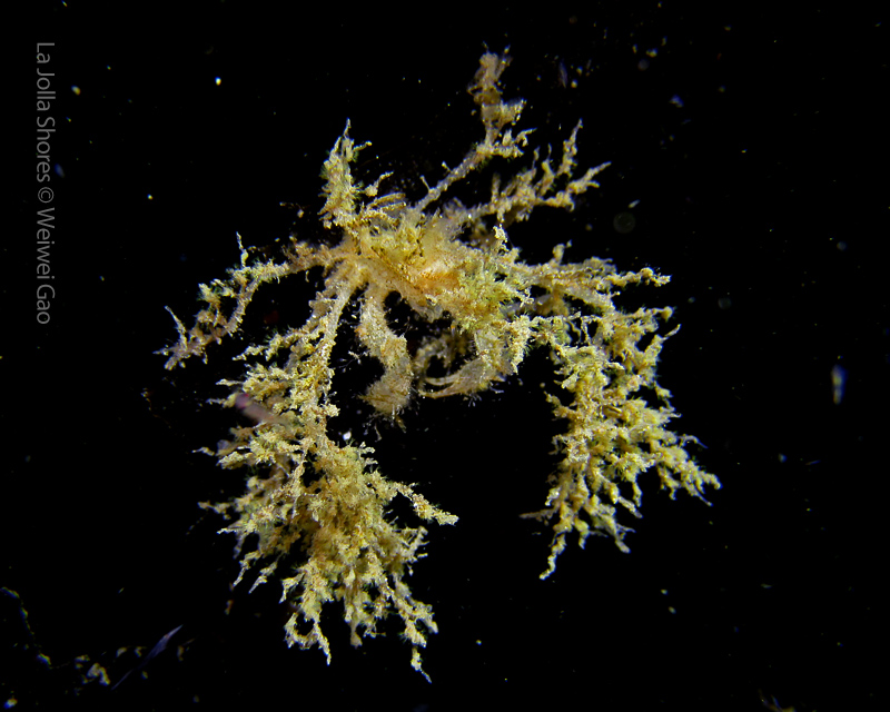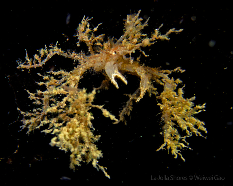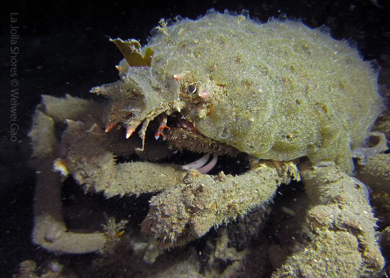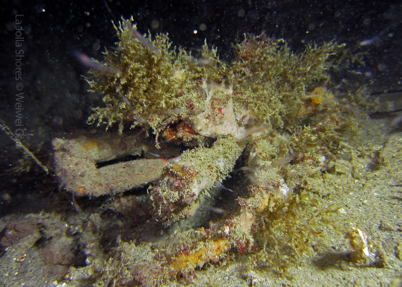 The waves at the shores finally calmed down and the extraordinary visibility has been reported in the last a few days. I buddied up with Trevis and headed out to Vellocitos Point. Indeed, the visibility was superb! I have been complaining that the canyon looked so quiet during the day, however at night it was a different story. Once we got to the canyon, we were greeted by quite a few sheep crab and octopus. A few minutes into our dive, we spotted an adult horn shark gouging ferociously along the canyon. He basically ignored our presence and nearly buried his whole head into the kelp. We stopped and watched the tremendous process. After the shark finished, he swam around us for a few circles and landed again on the canyon. We decided to leave the shark and furthered out south. Along the way, a few little kelp crab caught my eyes – not only they looked funny in their camouflage, but their trying to catch krills was quite entertaining.  So I slowed down and took a video of it.