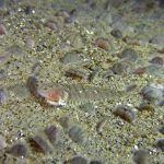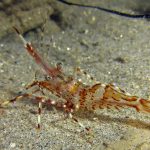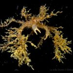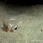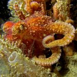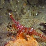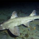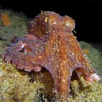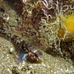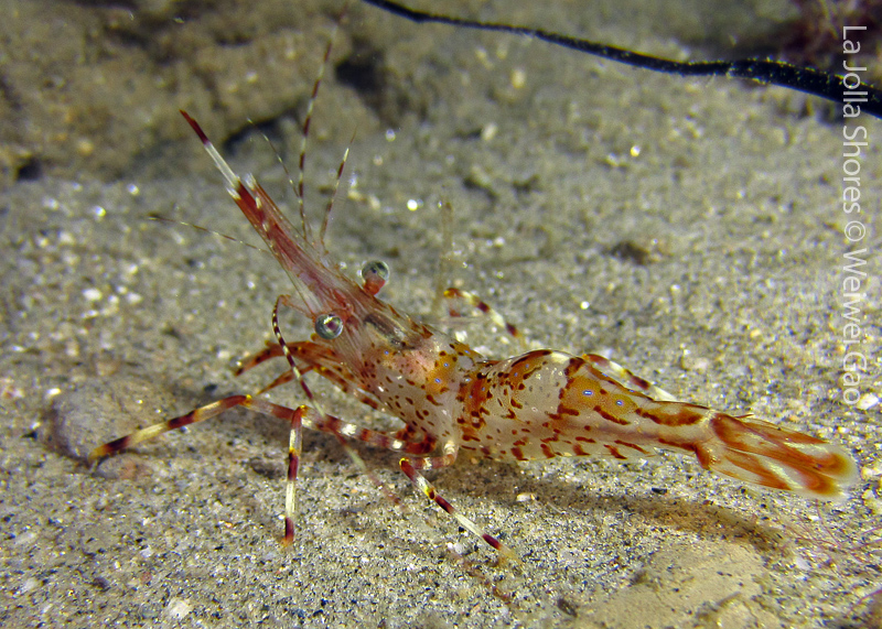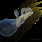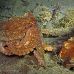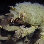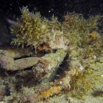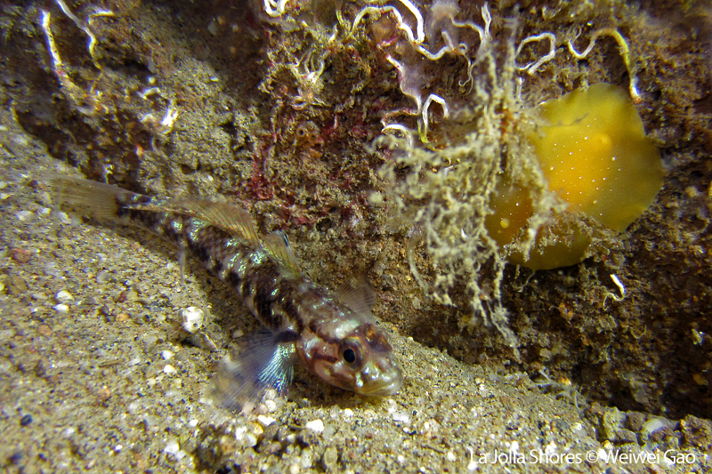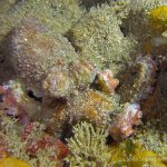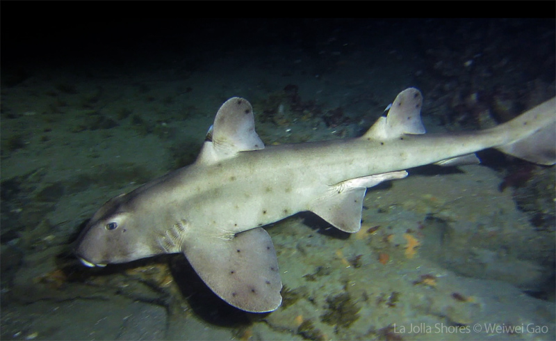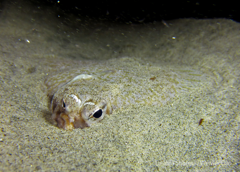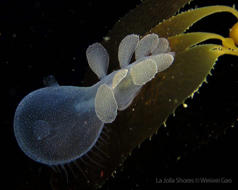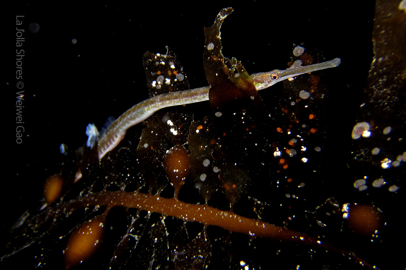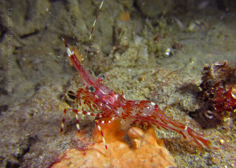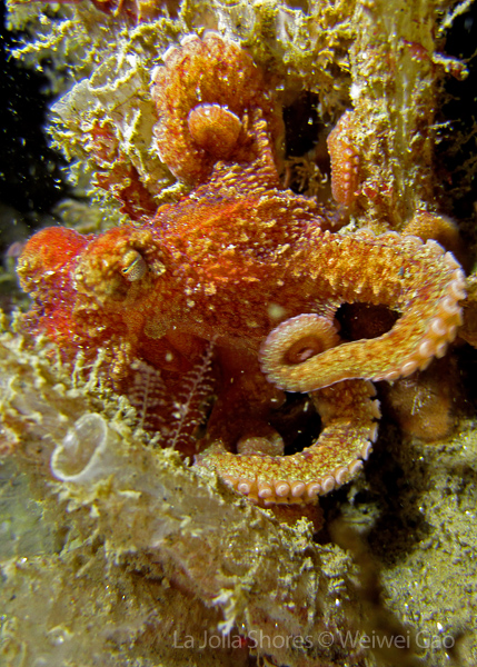The waves at the shores finally calmed down and the extraordinary visibility has been reported in the last a few days. I buddied up with Trevis and headed out to Vellocitos Point. Indeed, the visibility was superb! I have been complaining that the canyon looked so quiet during the day, however at night it was a different story. Once we got to the canyon, we were greeted by quite a few sheep crab and octopus. A few minutes into our dive, we spotted an adult horn shark gouging ferociously along the canyon. He basically ignored our presence and nearly buried his whole head into the kelp. We stopped and watched the tremendous process. After the shark finished, he swam around us for a few circles and landed again on the canyon. We decided to leave the shark and furthered out south. Along the way, a few little kelp crab caught my eyes – not only they looked funny in their camouflage, but their trying to catch krills was quite entertaining.  So I slowed down and took a video of it.