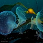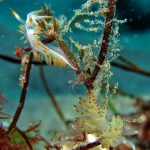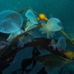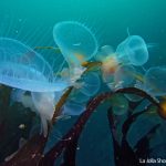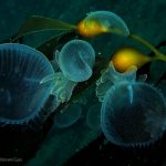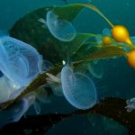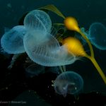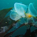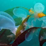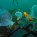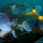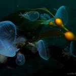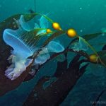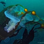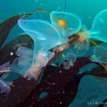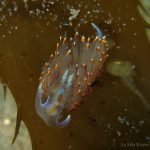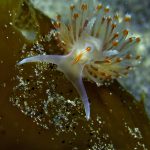 Lion’s mane nudibranch has a very distinctive appearance that differs from most of the other sea slugs. Their extended hood, decorated by elongated tentacles, waves gently along the surge. Their unique bright white color contrasts with the dark brown of the kelp, making them look pure all the time. Sometime a big family of them is bundled together on the kelp with individuals of different sizes and you will find all of them so adorable.