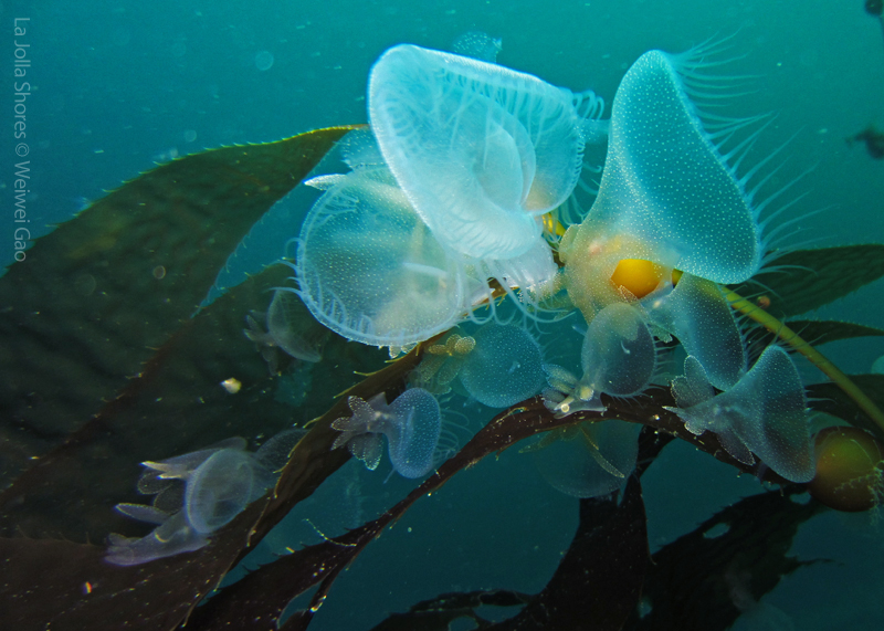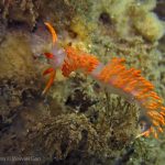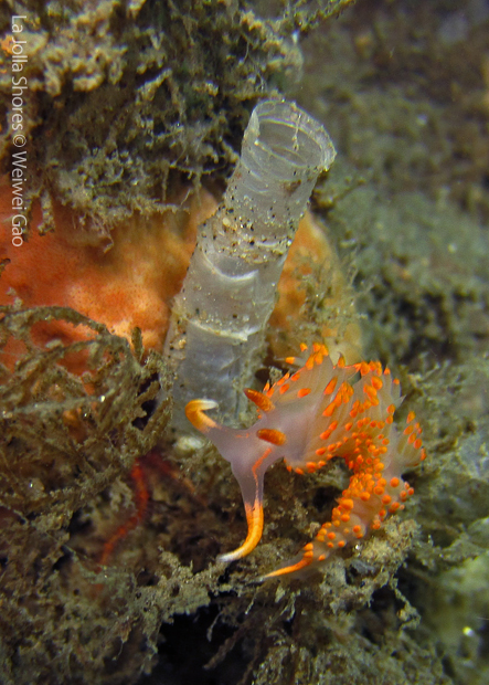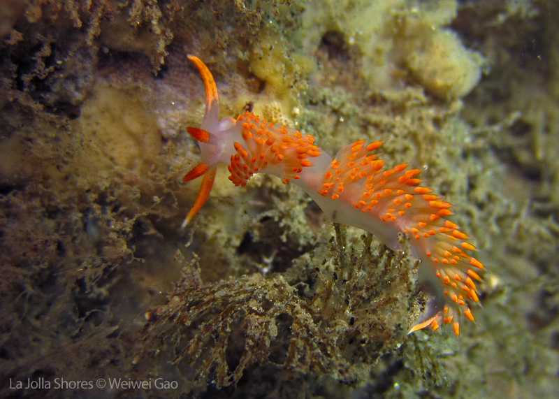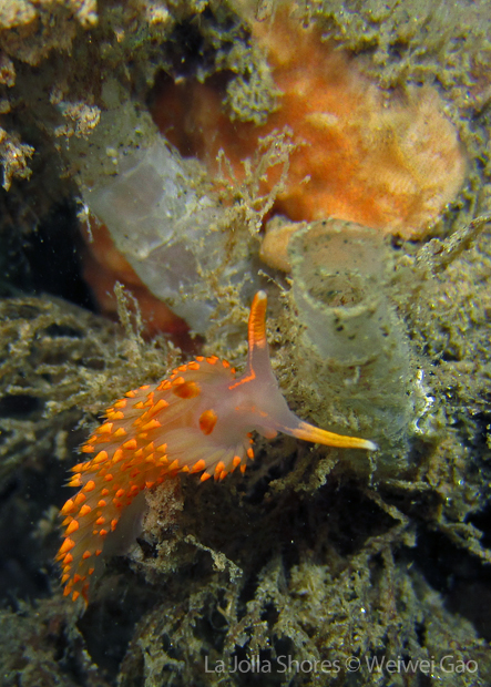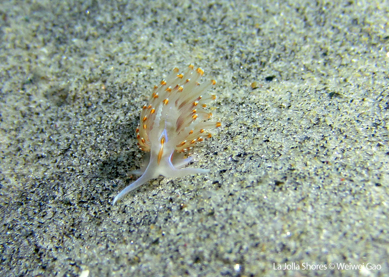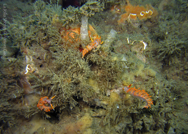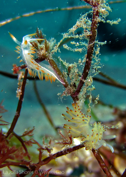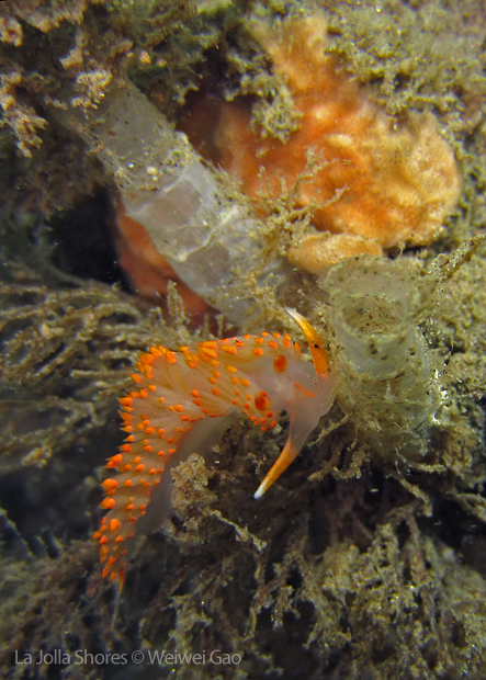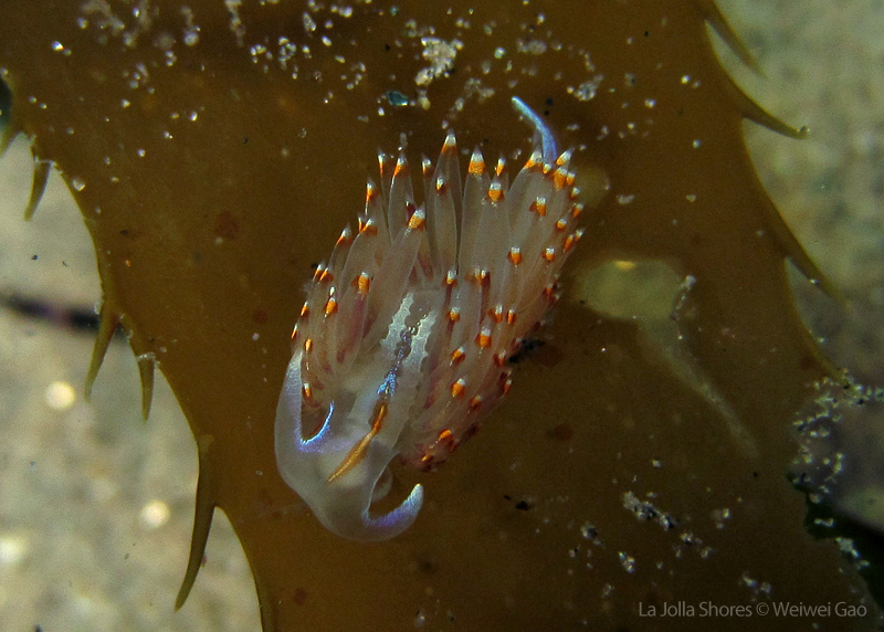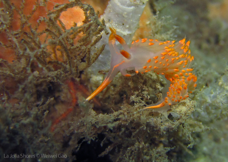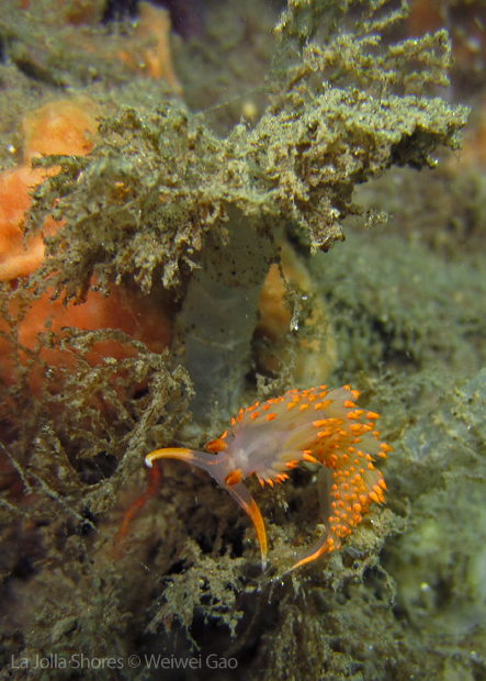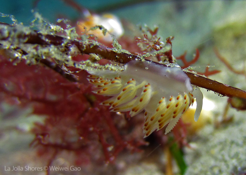 La Jolla Shores in the early morning is beautiful. Not only the lion’s mane nudibranch, but also other nudies are out and enjoying the morning time. Right on the point, I come across the family of Stearn’s Aeolid, which I also saw last night. They are crawling on the grass and each other them looks very busy.
