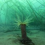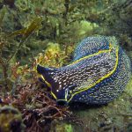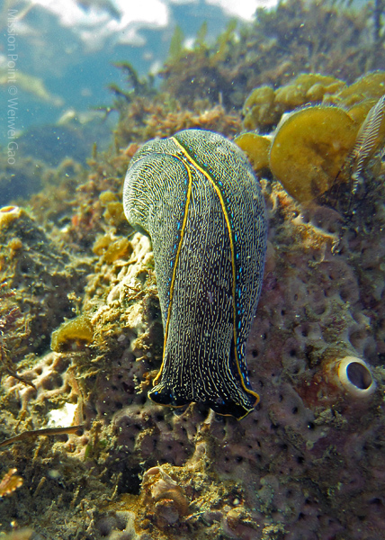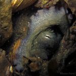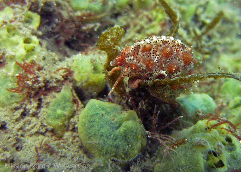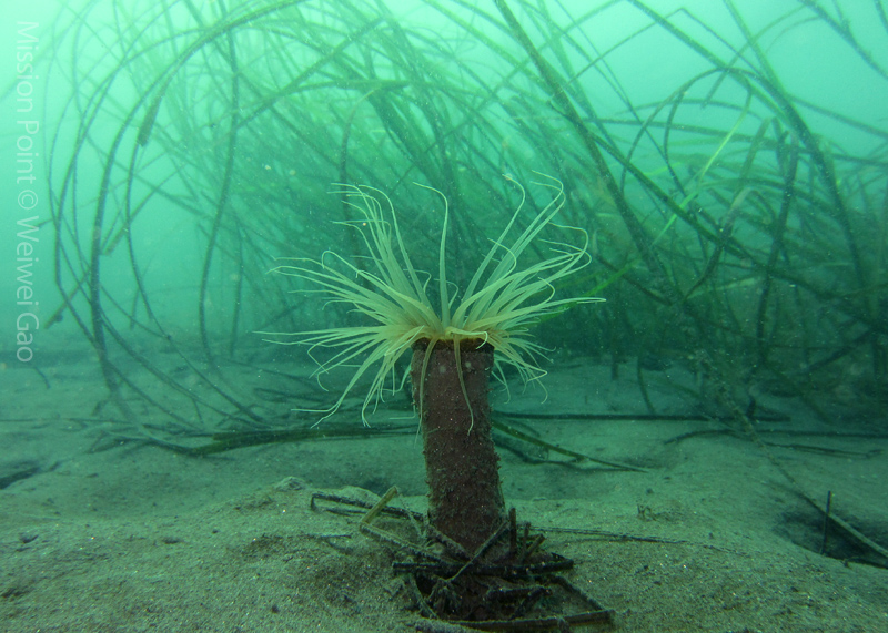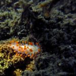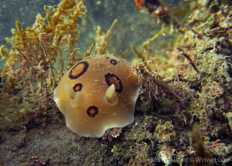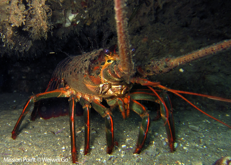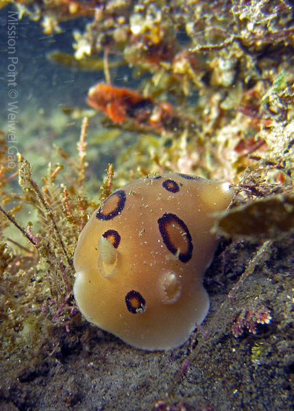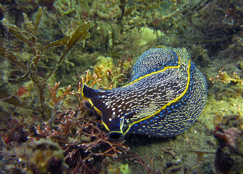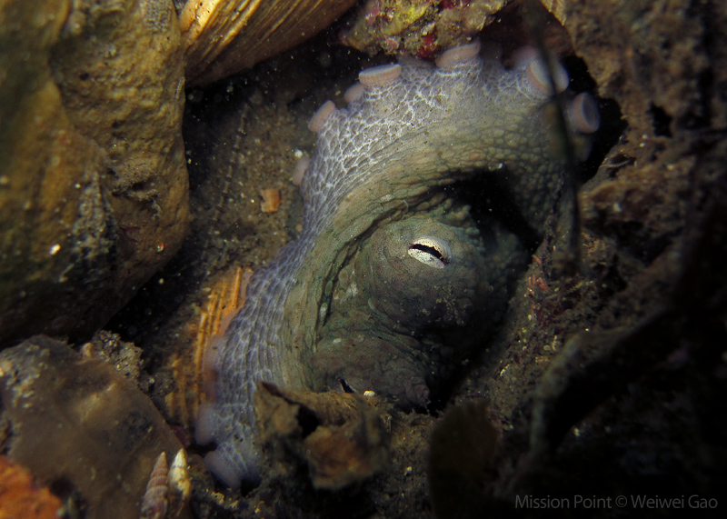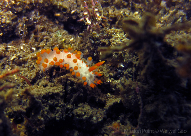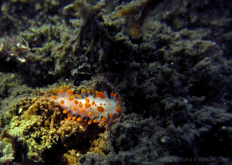 After an incredible diving at the oil rig, I headed out with Mike to Mission Point. Instead of following the bank connected to the shore, we decided to swim to the center and dive around the peninsula. The water was calm and the swim was not difficult. The boulders looked the same as the other side. We descended to around 15ft water and started to search for interesting creatures. As usual, the place was full of navanax and I was surprised I wasn’t too tired of seeing them. They came with different sizes and some of them had really bright color. When I came across this guy, I slowed down, positioned myself next to the rock and took the video.