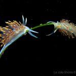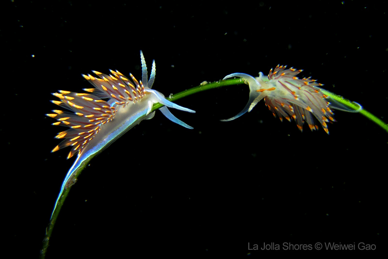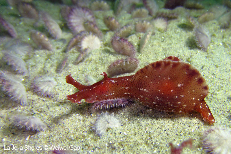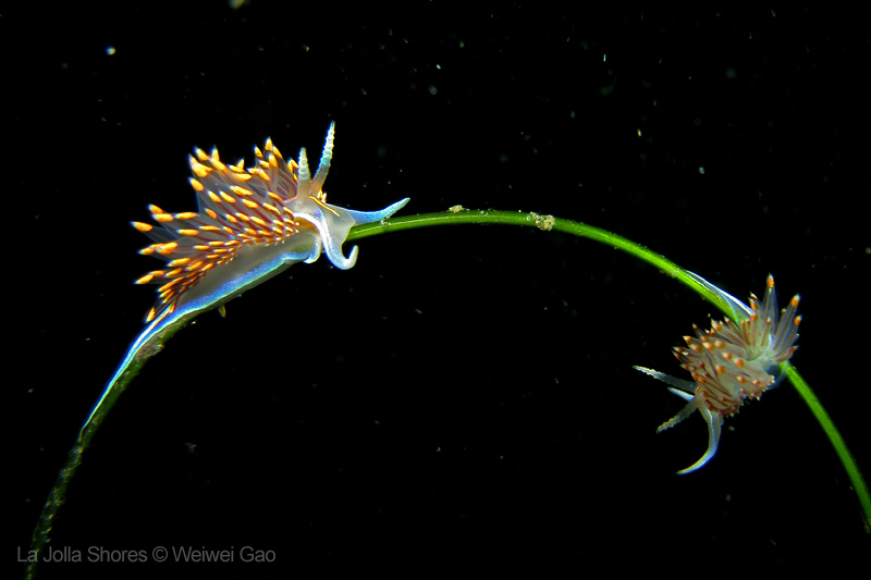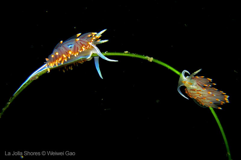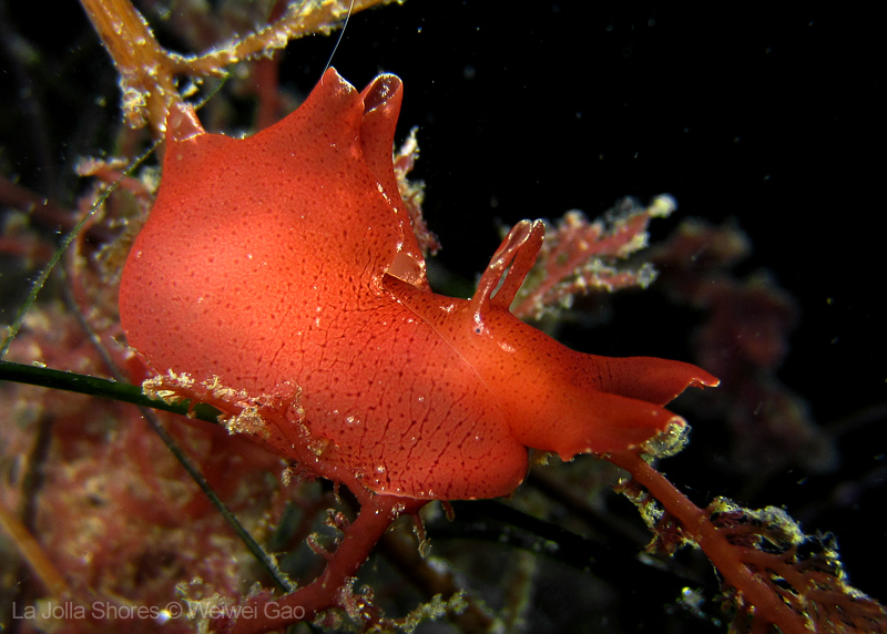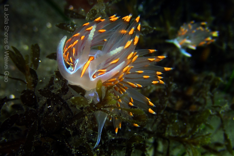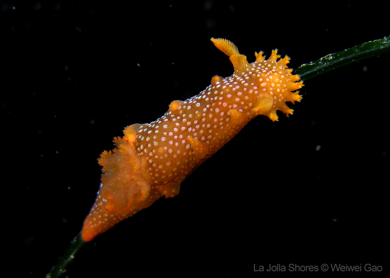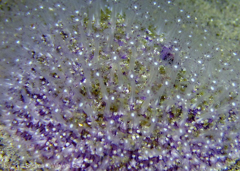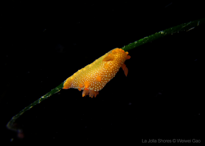 For the second dive, we decided to visit the Vallecitos Point, despite a big pack of students heading to the same direction. Looking far, the visibility was indeed poor; but looking close, what an amazing show! The white sea urchin was running fast. The navanax was patrolling. A group of giant sheep crabs, instead of being shy, jumped really high to snap me. On the canyon wall, sea lemons were all paired up and having a good time to themselves. Above the canyon, a giant halibut appeared but quickly took off before I could get my camera ready.