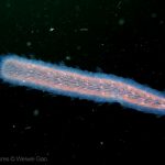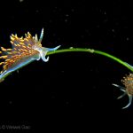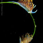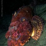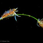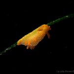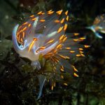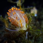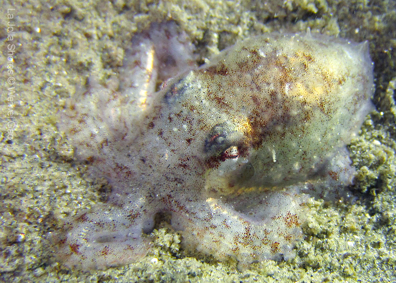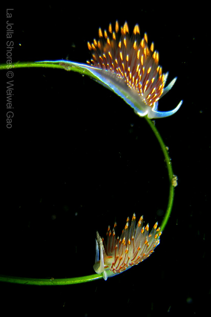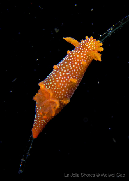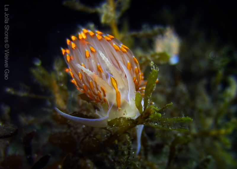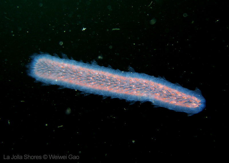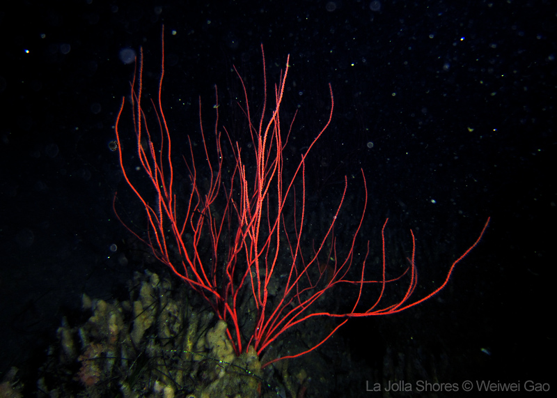 On my way back, I stopped at the crap patch. This place was a wonderland. A big scorpionfish was taking a morning nap, an octopus was putting up a solo dance, drifting Pyrosoma atlanticum was emitting mysterious light, Hermissenda was all out on the grass, and the baby Triopha was crawling out to the branches to see the world.