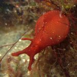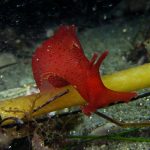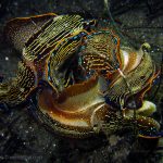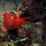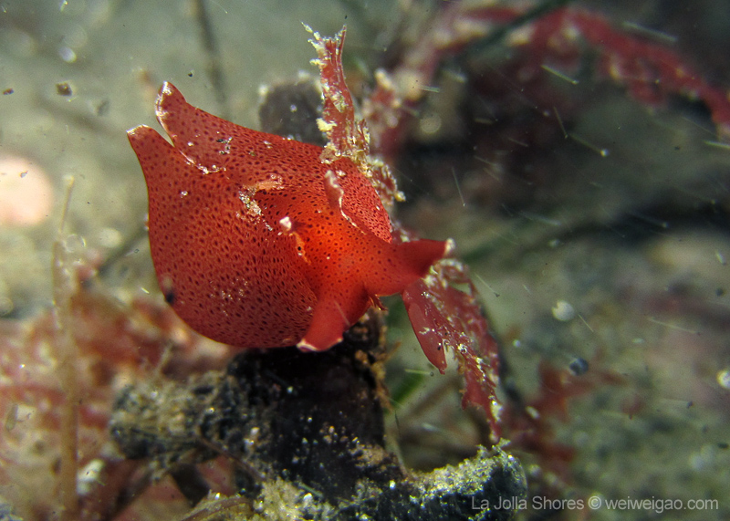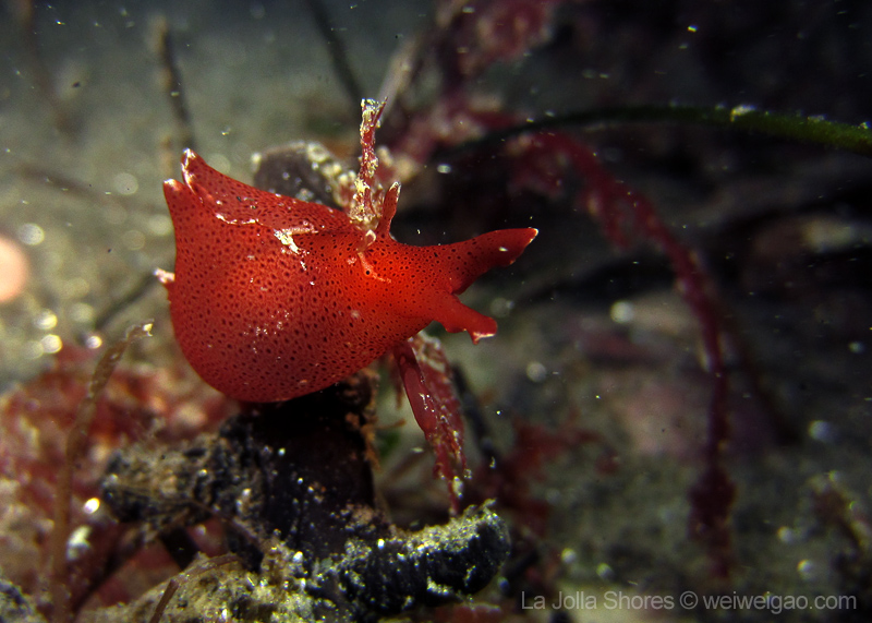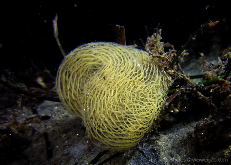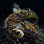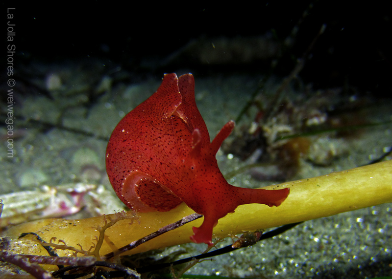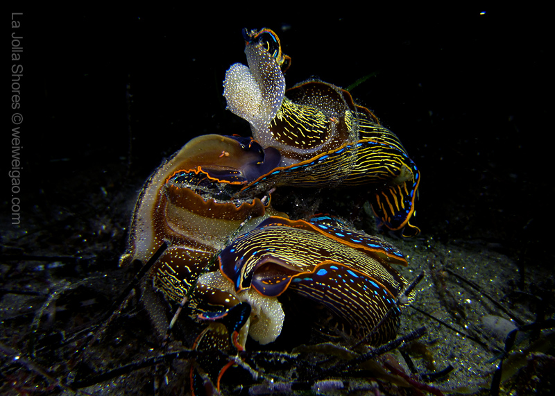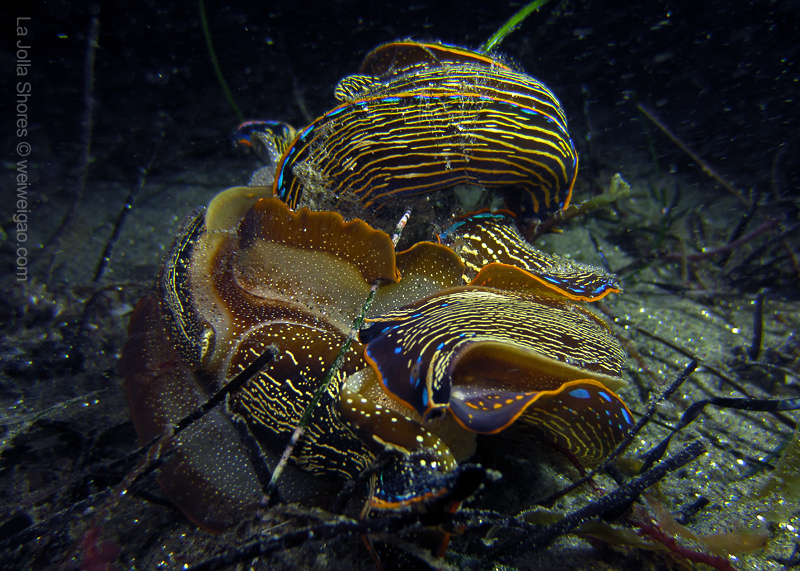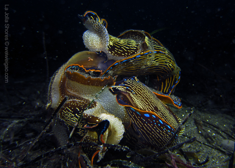 My frequent visit to the patch allows me to look at the behavior pattern of navanax. This morning, I came across a few of them, and was puzzled by their strange postures. These are three individual Navanax, connected head to tail. Their lobes are wide open, exposing their gills, the bright white part that normally hidden. They stayed motionless for quite a while, and the one at the bottom slowly closed the body and departed.