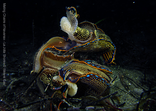 “Navanx inermis may also form copulatory chains of as many as four individuals. In such chains, the individual at the front acts as a female, the individual at the end acts as a male, and individuals in the middle act as both male and female. Chain copulations are not uncommon in crowded laboratory aquaria, but seem to be rare under natural conditions (Canadian Journal of Zoology, 1985, 63: 2719-2729)”