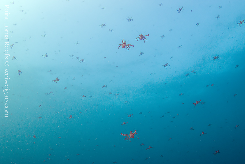 Just to add to Steve’s report. The scene of the tuna crab at the Point Loma was really cool. These little bugs were smart. They hang around 15 ft water, above fish and below birds, a relative safe place from the predators. In some pockets of water they were so packed that I felt in an alien world. They basically just sat there, busy catching the micro-organisms passing by – what a laid back lifestyle. They were also vigilant – it’s hard to get really close. What a cool encounter.