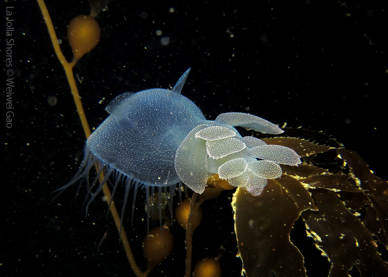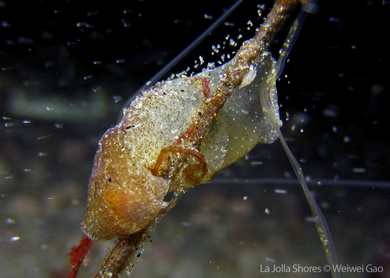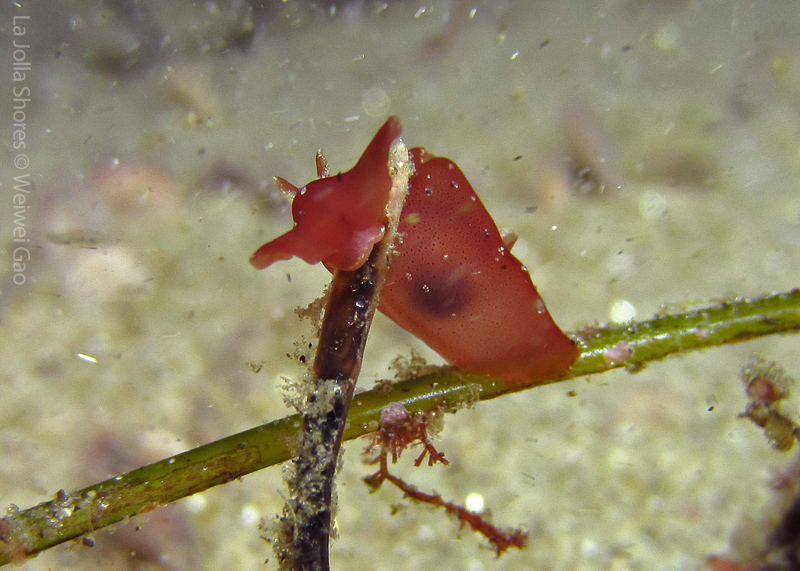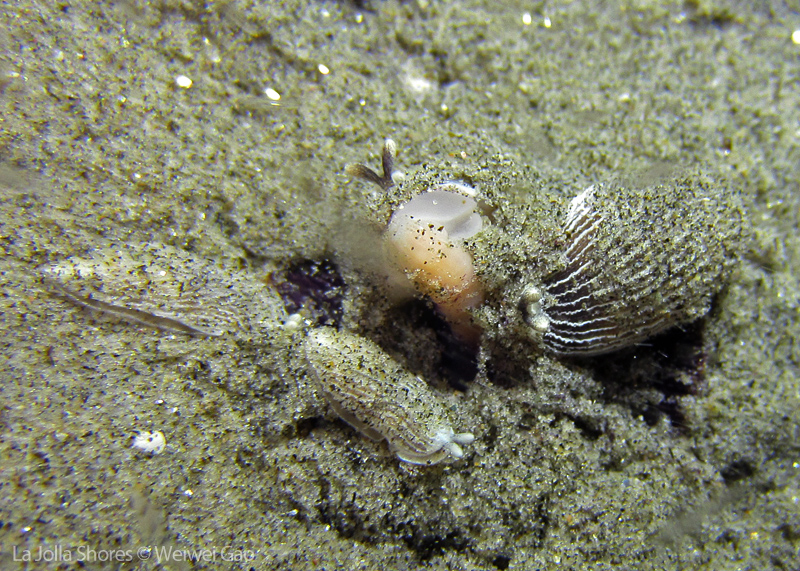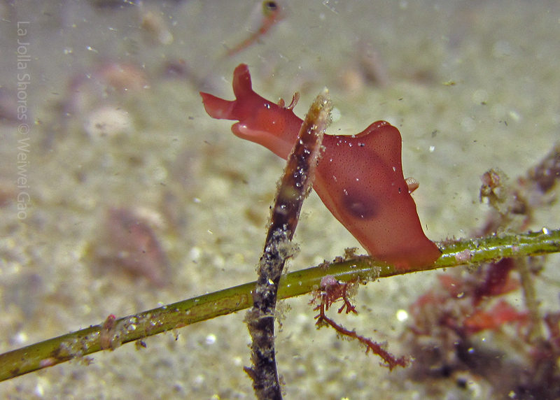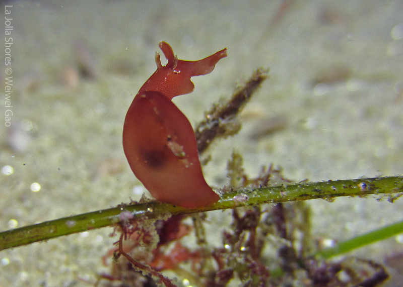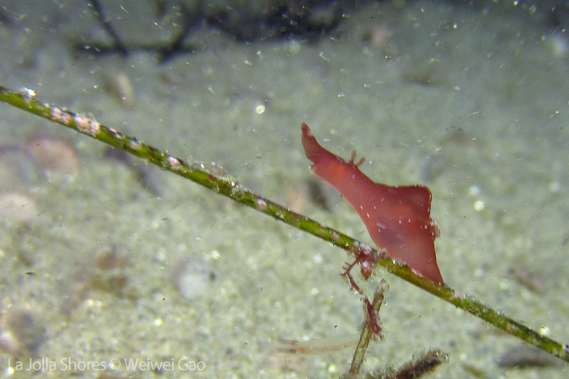 I didn’t see many nudies even at the Vellocitos Point. So about half way through the dive, we turned toward the shore. To our surprise, the sand dollar field was teemed with all kinds of life. It was a surprise to see a few baby sea hares and they definitely belong to the cutest creatures you could think of. They were so tiny that I could see clearly their outlines. They were crawling along the grass, making turns and stretching their bodies. Because they were so small, I had a pretty difficult time to focus my camera. Here are a few shots of one baby sea hare on the grass.
