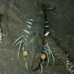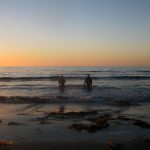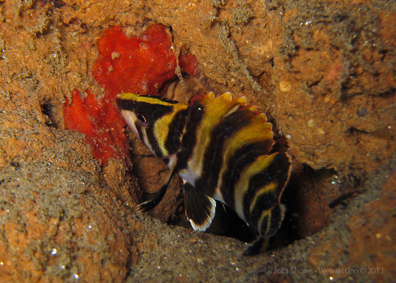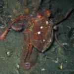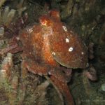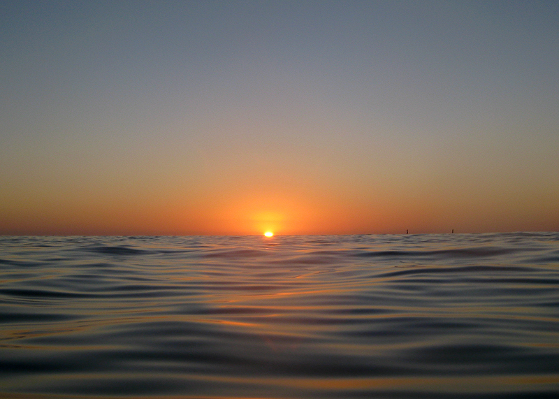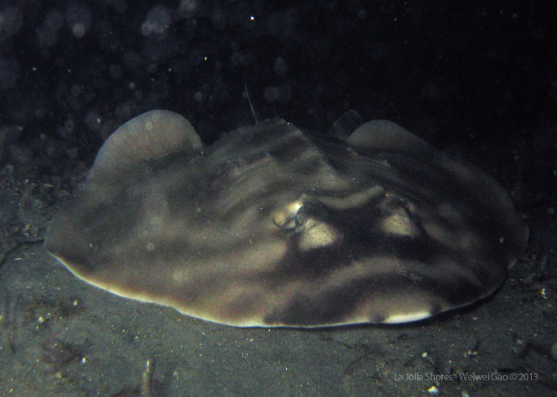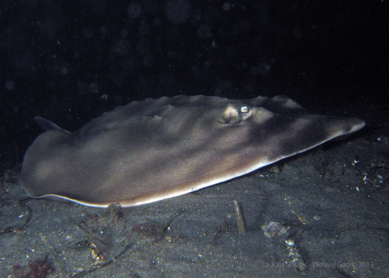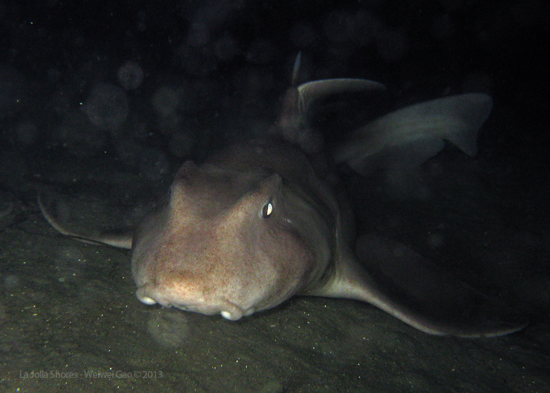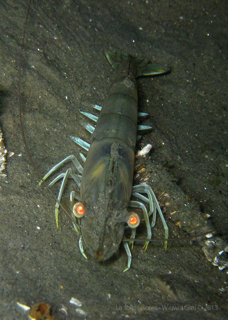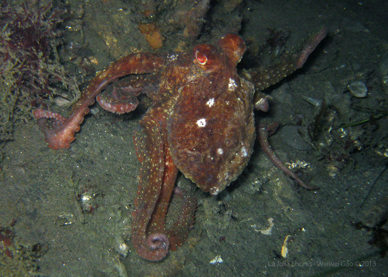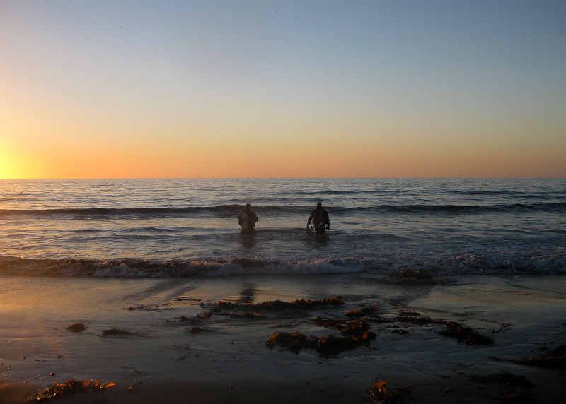 A quick night dive at La Jolla Shores and the water was warm. The days got shorter and I had to get ready fast to catch the twilight, and the sunset on the swim-out was beautiful. The sea was as flat as it could get. All the creatures came out and I had my first experience with of the squid – a single one. It was shining and the color on its body formed a rainbow band that was flowing like neon light. It swam in font of me like a shining star.