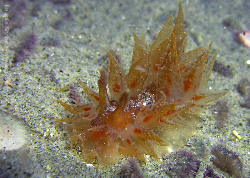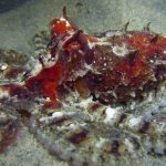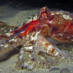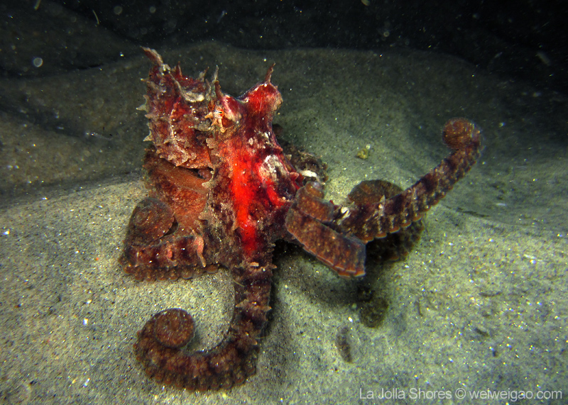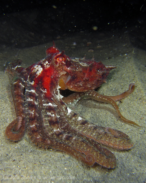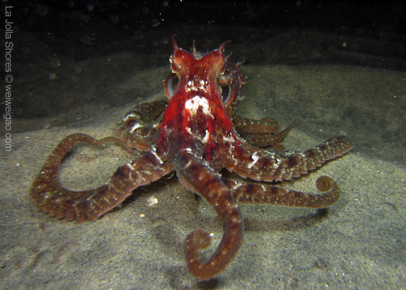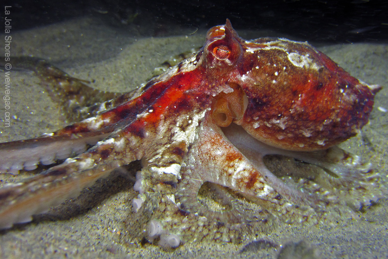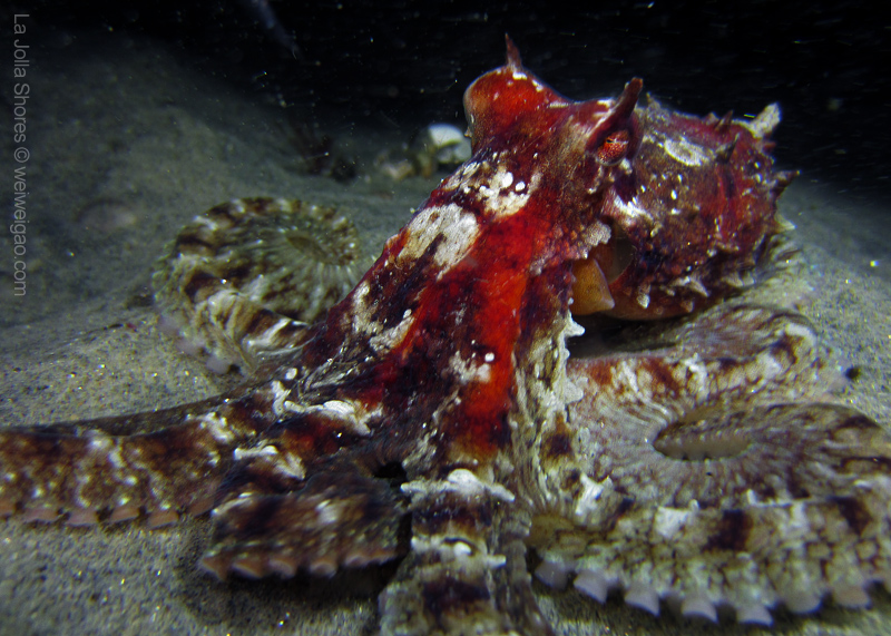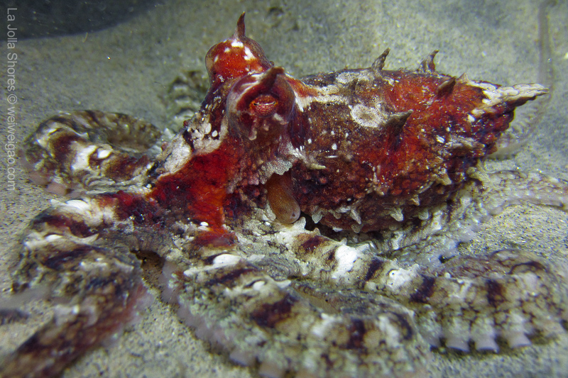 Once I dropped down onto the sandy shallow bottom, this octopus was right in front of me. With its flamboyant color, I had to make a stop.