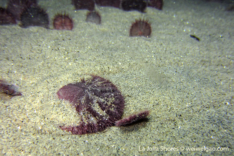 I headed out to the shores but was super late – got into the water around 9. The waves picked up so the surface was rough. I had to drop off early to avoid the choppy surface. But the condition underwater was nice. The sea was calm and I could even see the track left by the sand dollars.