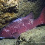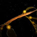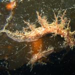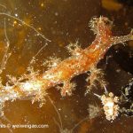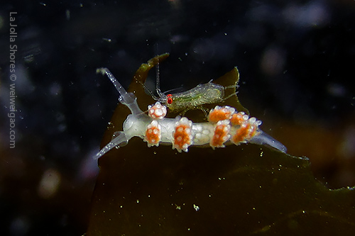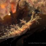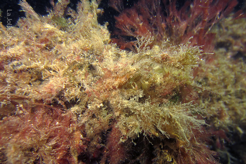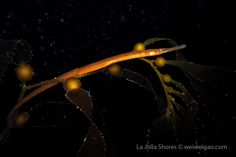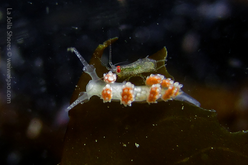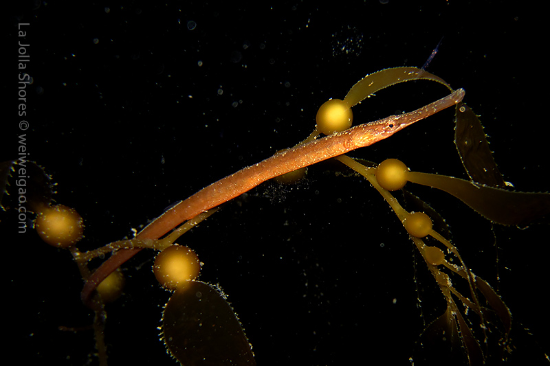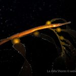 Kicking out was easy. I dropped off near the main wall and the vis was very good. On the main wall, I found a few Cuthona divae laying eggs. On the ledge, there was a huge lizard fish. Turning to my right, pipe fish was hiding behind the short kelp.