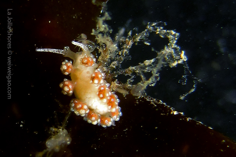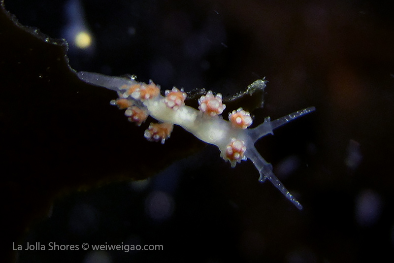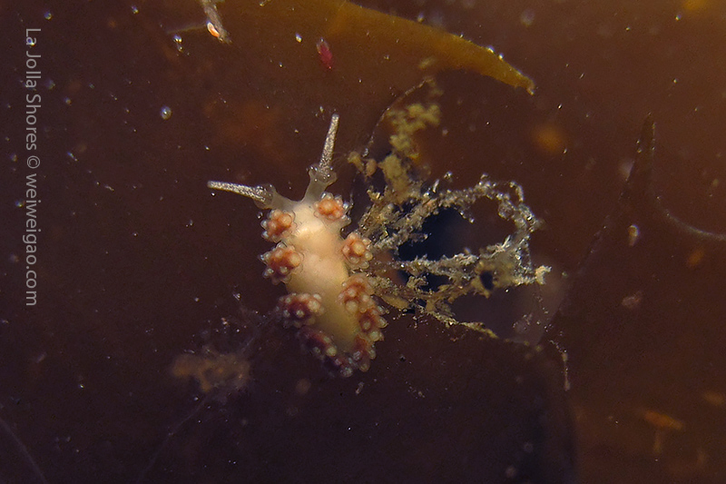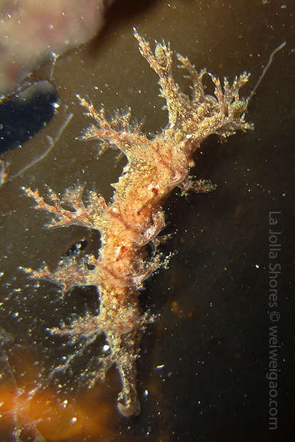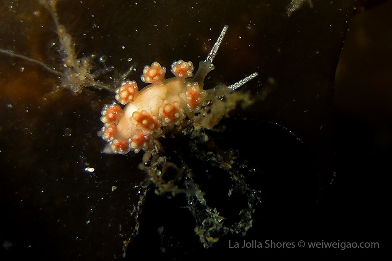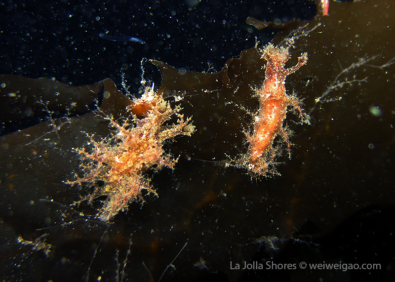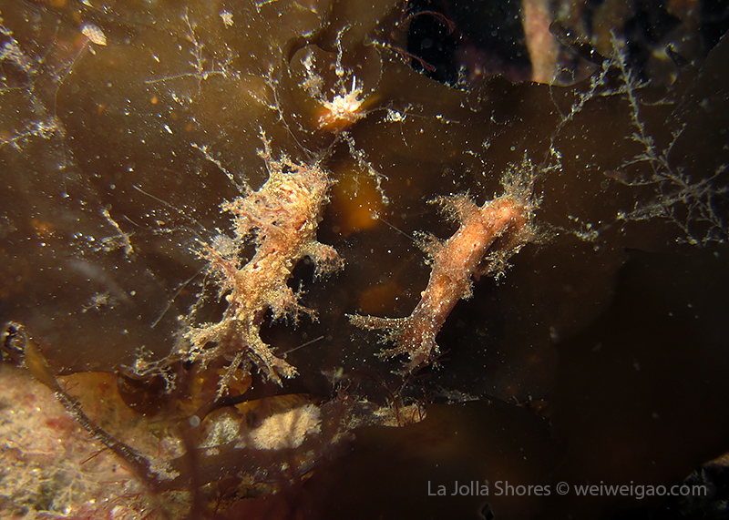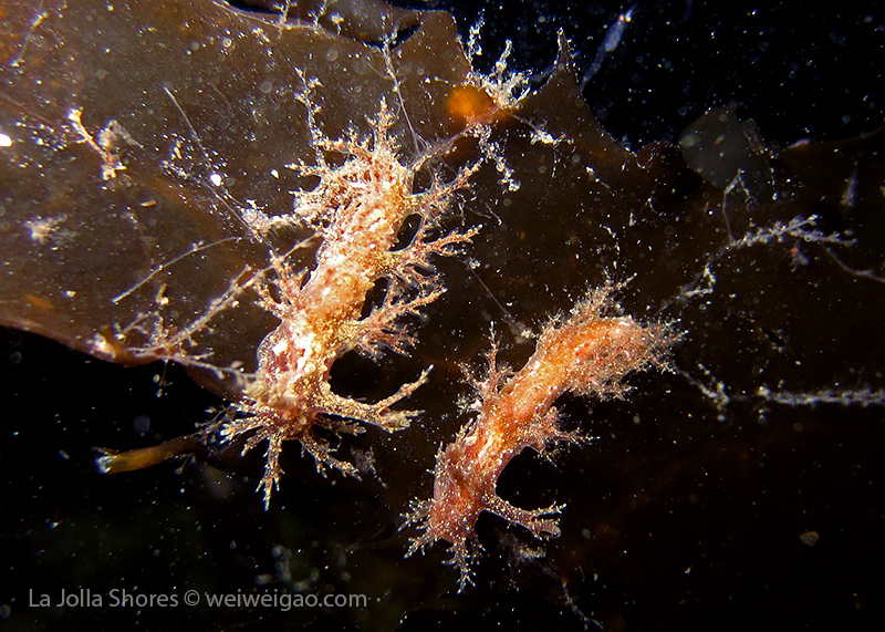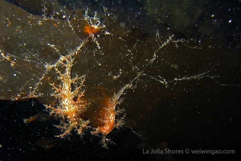 Almost immediately, I spotted a few Dendronotus frondosus. Unlike other nudibranch with flamboyant colors, they blend very well with the algae on the pipe, so well that I could see them only when they crawl on the kelp. This kind of nudibranchs are found less frequently but apparently the pipe is their home. I was excited to see a few of them together. Interestingly, their body has tiny spots that maybe fluorescent, reflecting light under the flash and making the pictures a bit over exposed.