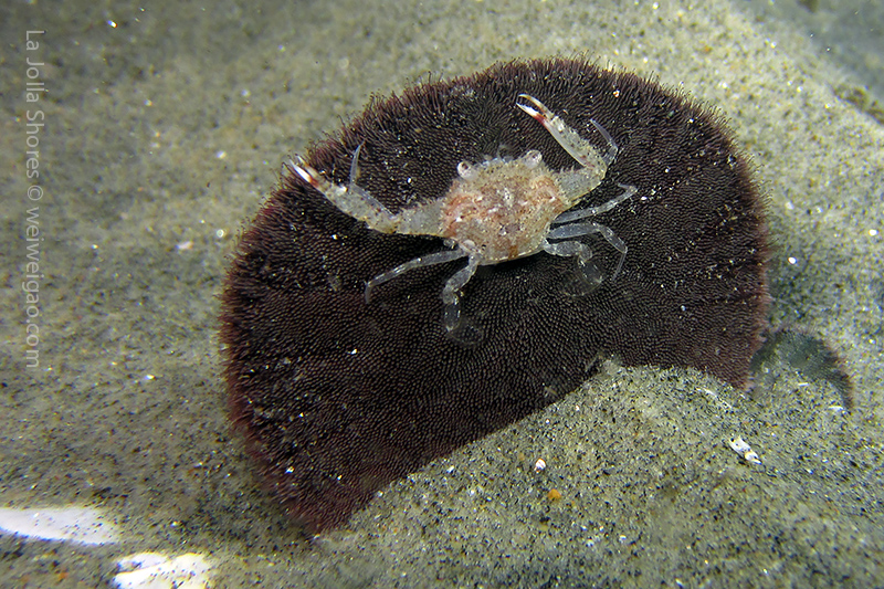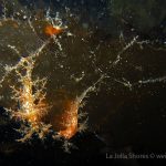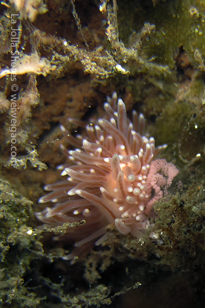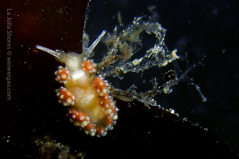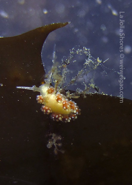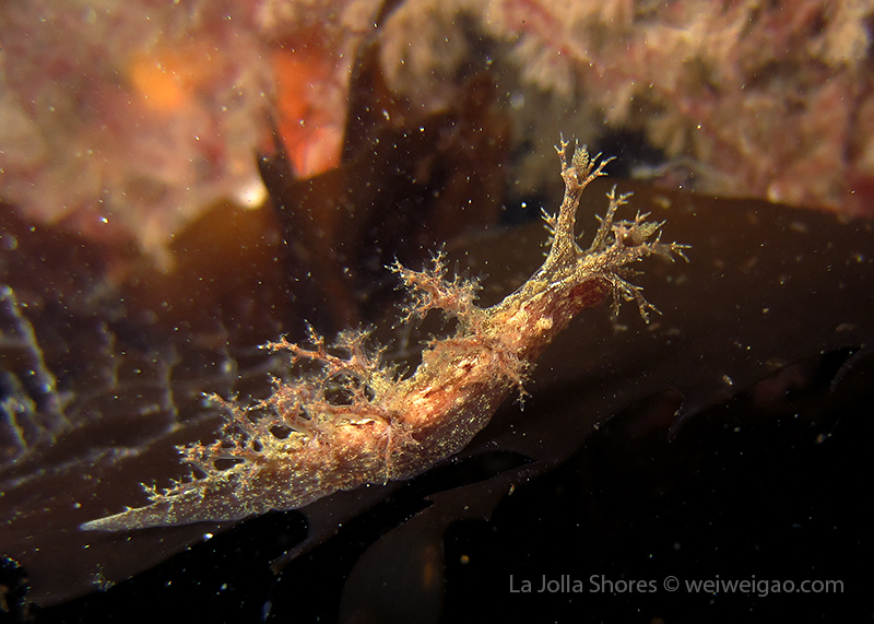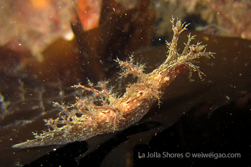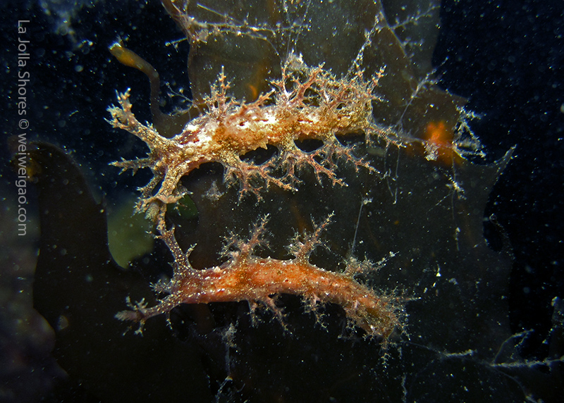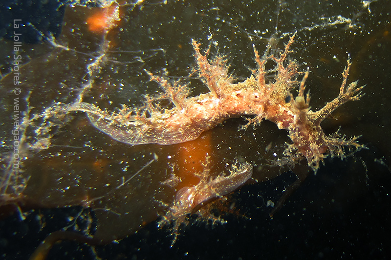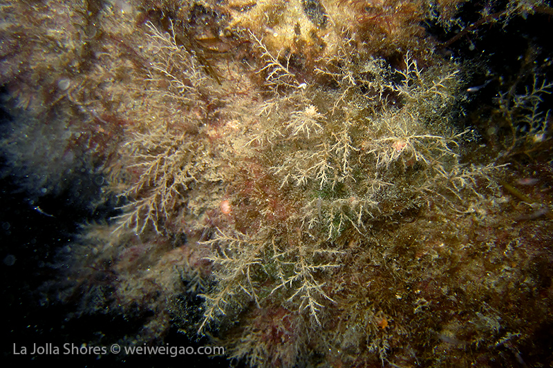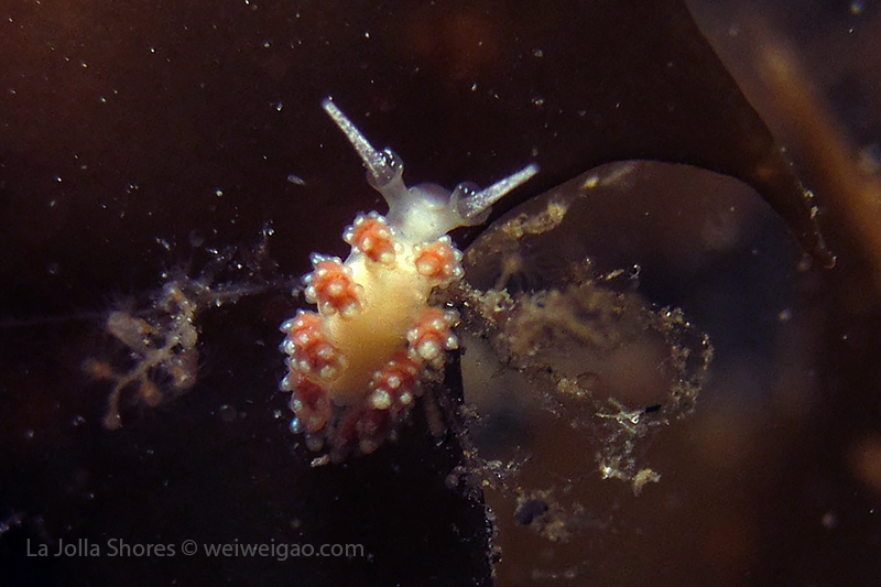 Almost immediately, I spotted a few Dendronotus frondosus. Unlike other nudibranch with flamboyant colors, they blend very well with the algae on the pipe, so well that I could see them only when they crawl on the kelp. This kind of nudibranchs are found less frequently but apparently the pipe is their home. I was excited to see a few of them together. Interestingly, their body has tiny spots that maybe fluorescent, reflecting light under the flash and making the pictures a bit over exposed.