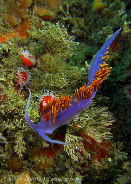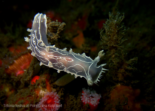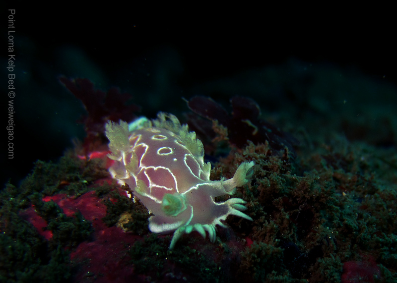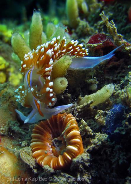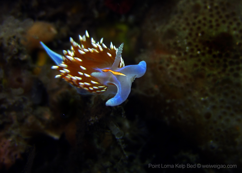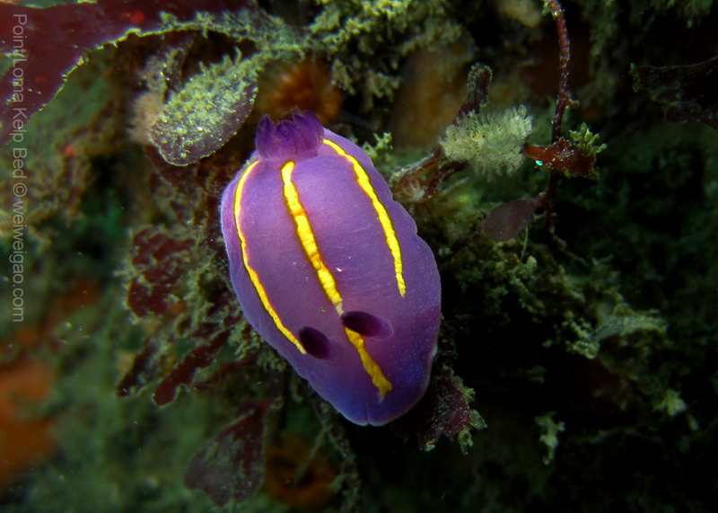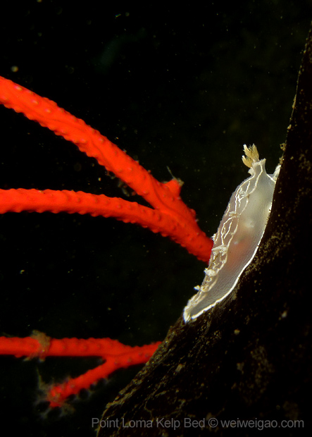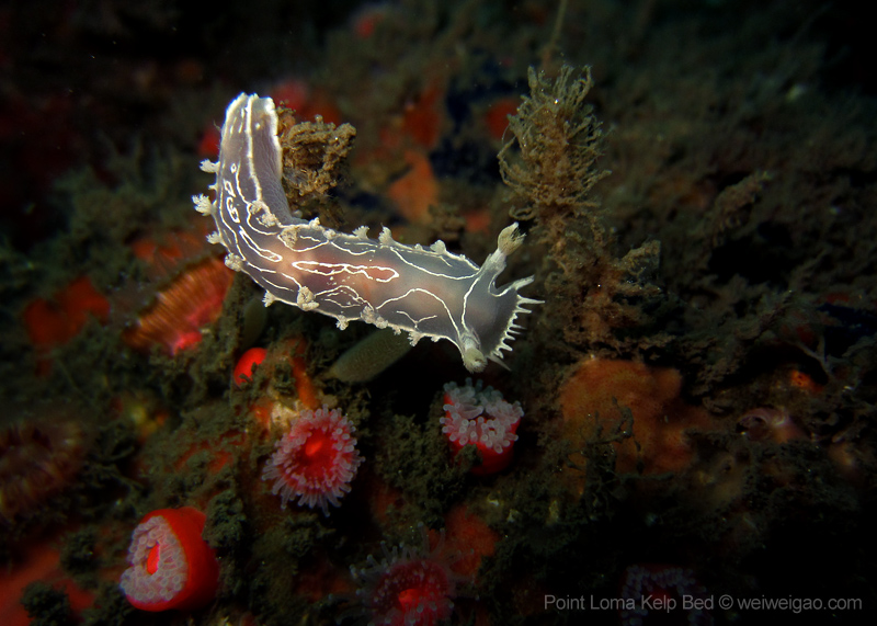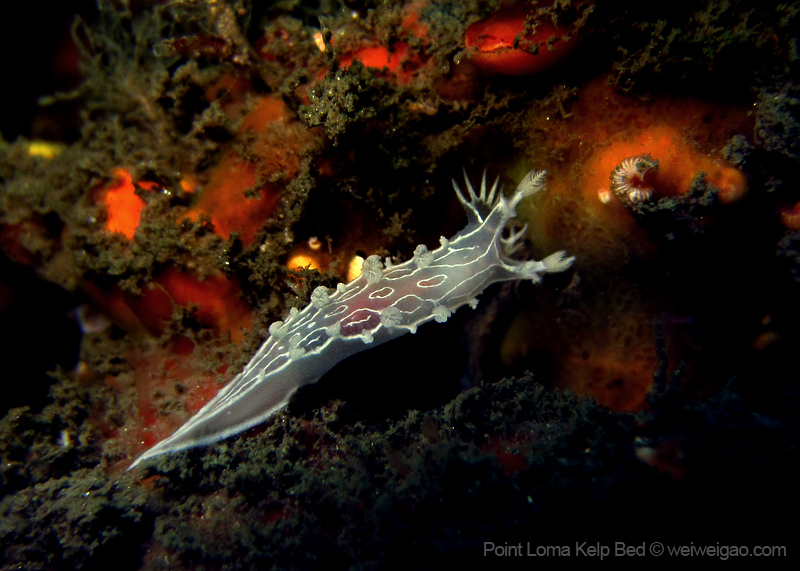 Today I headed out with Steve again to the Camel Head. David and Sean were also on board. It was a beautiful day with bright sunshine and flat sea. The first site Steve picked was Camel Head. It has a huge wall and amazing kelp. The visibility as amazing seen from the surface but was a bit milky near the bottom. As usual, Point Loma was beautiful with striking colors. For the second dive, we moved another site called Lazy Dazy. It was a nudibranch wonderland. The highlight of the dive was to get many opportunities to shoot Tritonia festiva. It was gorgeous!