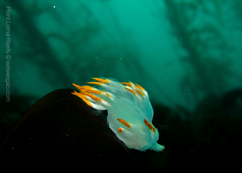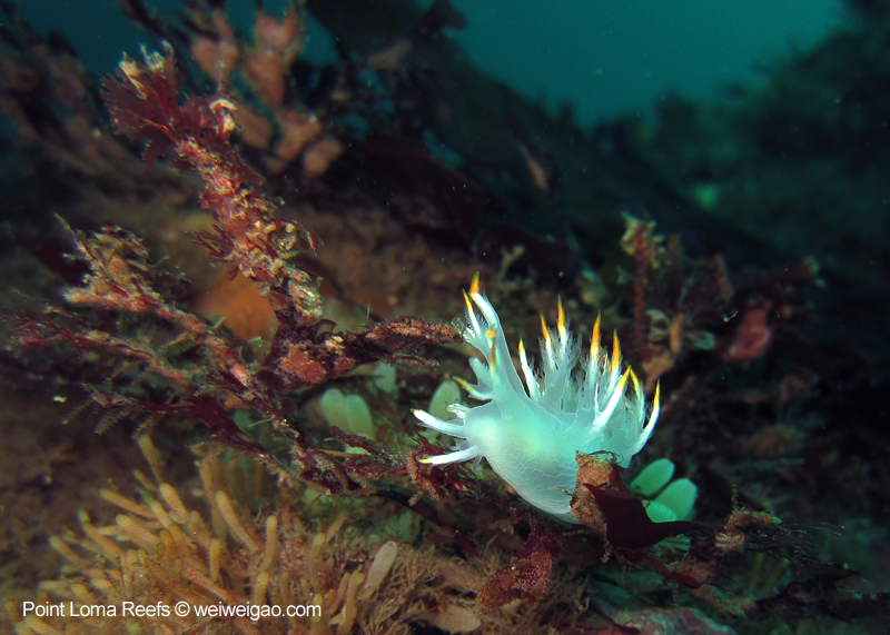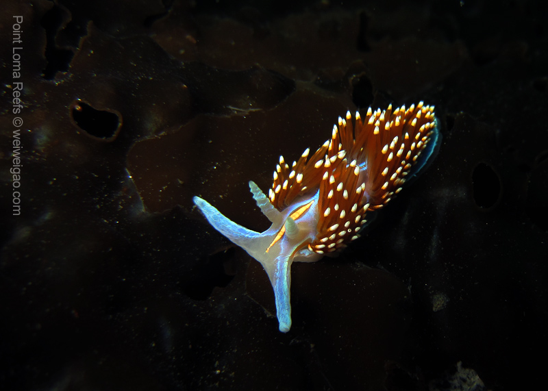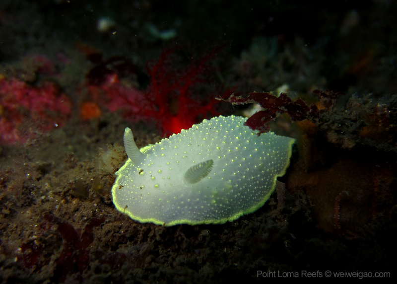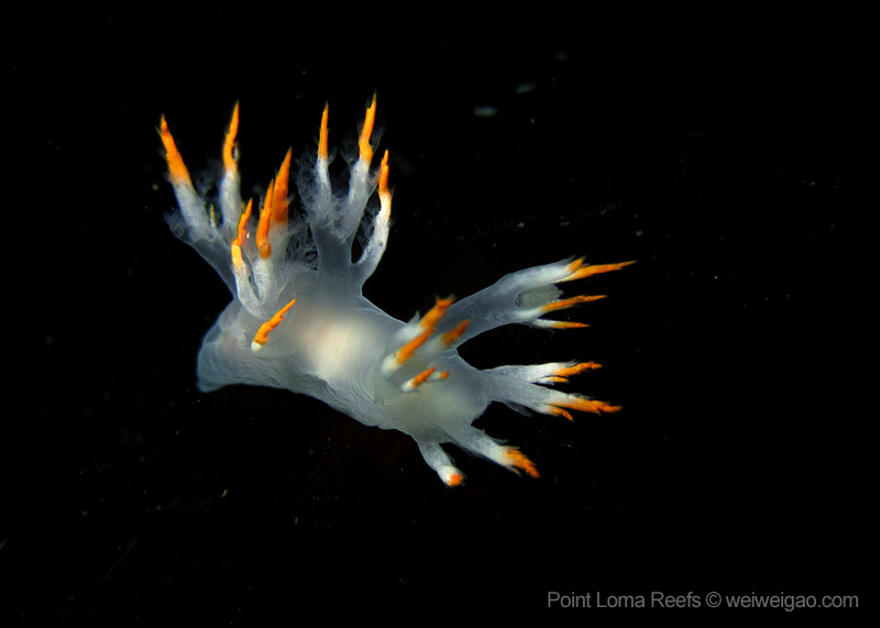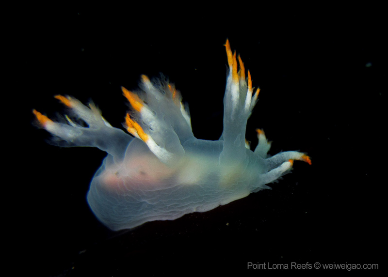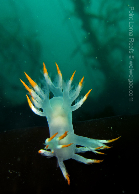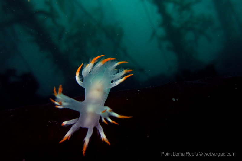 Once we dropped down, Steve pointed me a white dendronotid. This kind of nudibranchs is common at Point Loma but I never saw one before. Their big sizes and bright white color make them so obvious. I was hooked, and spent the whole dive on the same pinnacle. The one Steve showed me was on a kelp frond. Naturally the pictures showed a beautiful black background.
