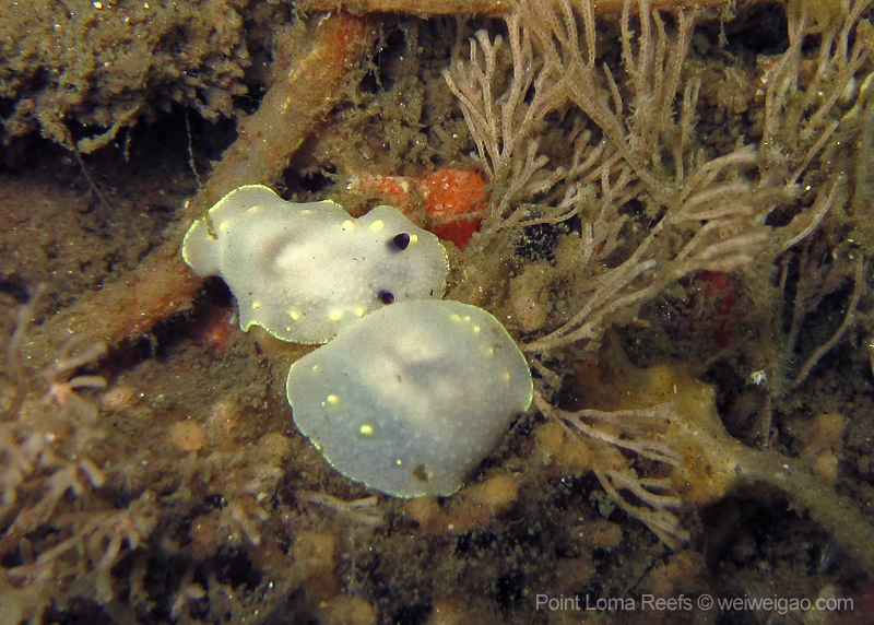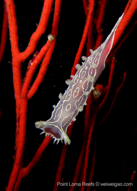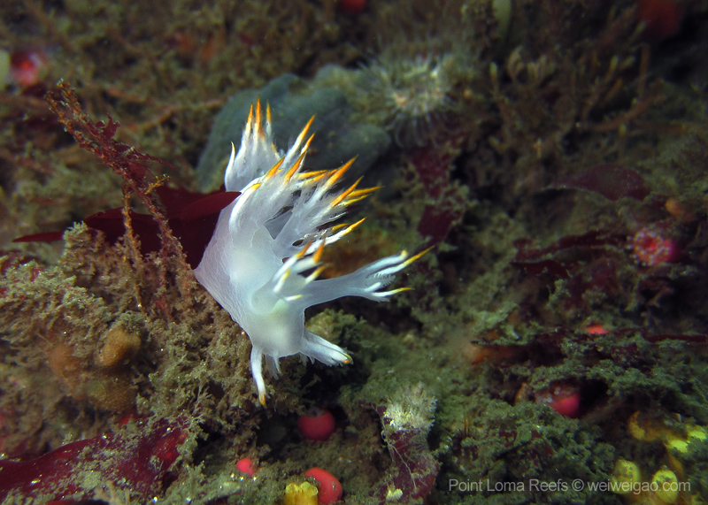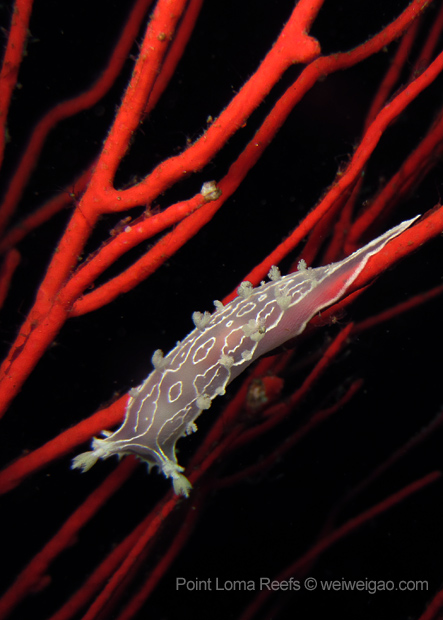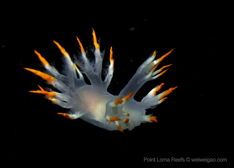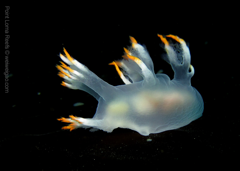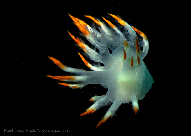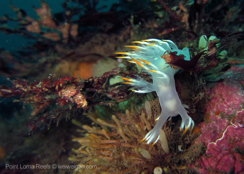 Once we dropped down, Steve pointed me a white dendronotid. This kind of nudibranchs is common at Point Loma but I never saw one before. Their big sizes and bright white color make them so obvious. I was hooked, and spent the whole dive on the same pinnacle. The one Steve showed me was on a kelp frond. Naturally the pictures showed a beautiful black background.