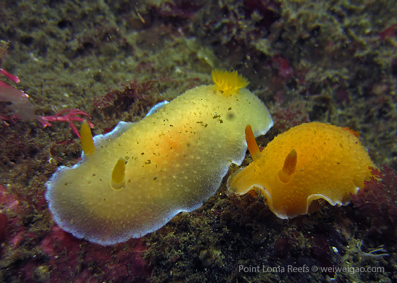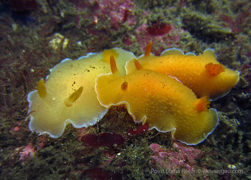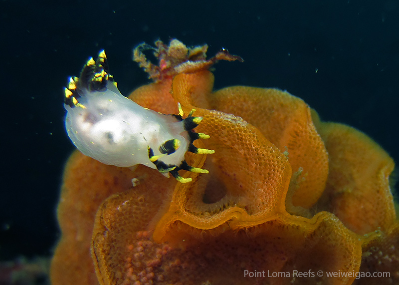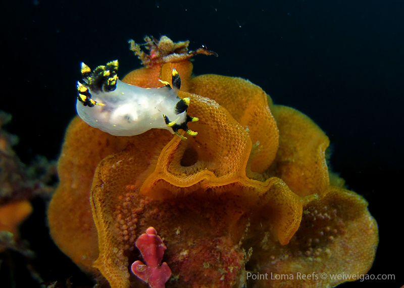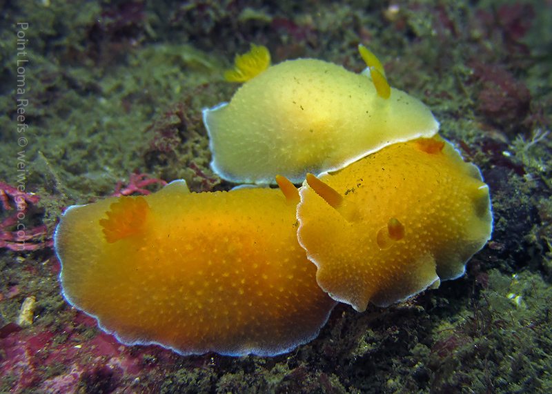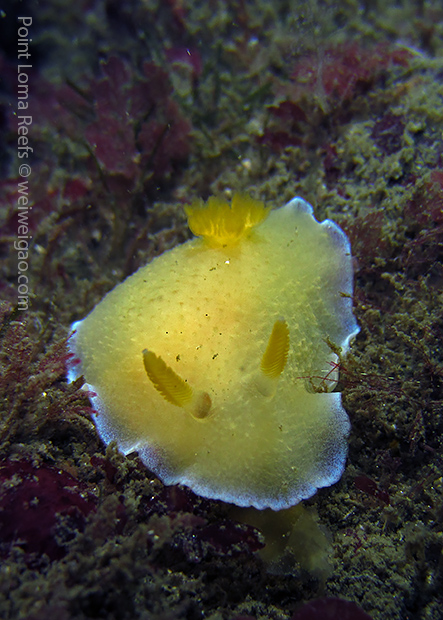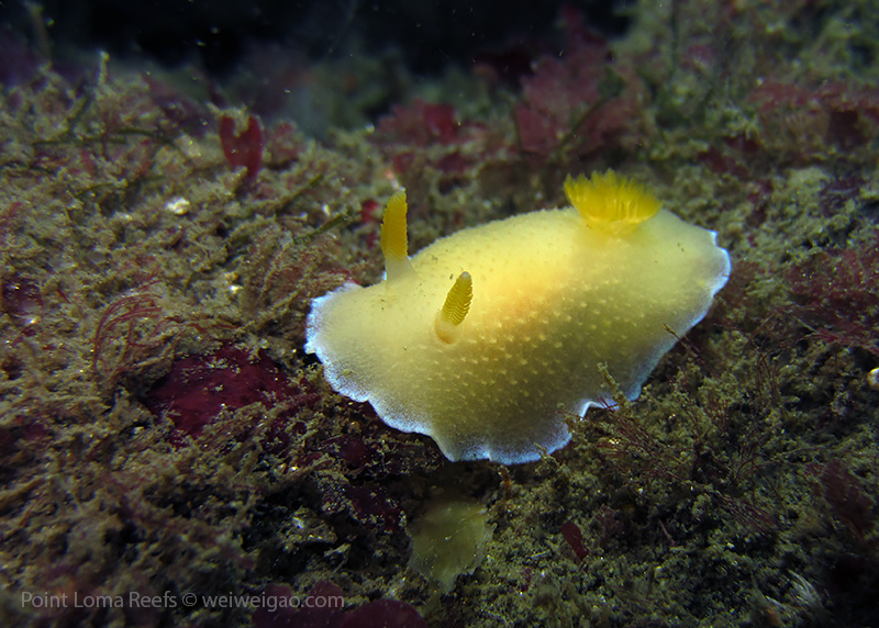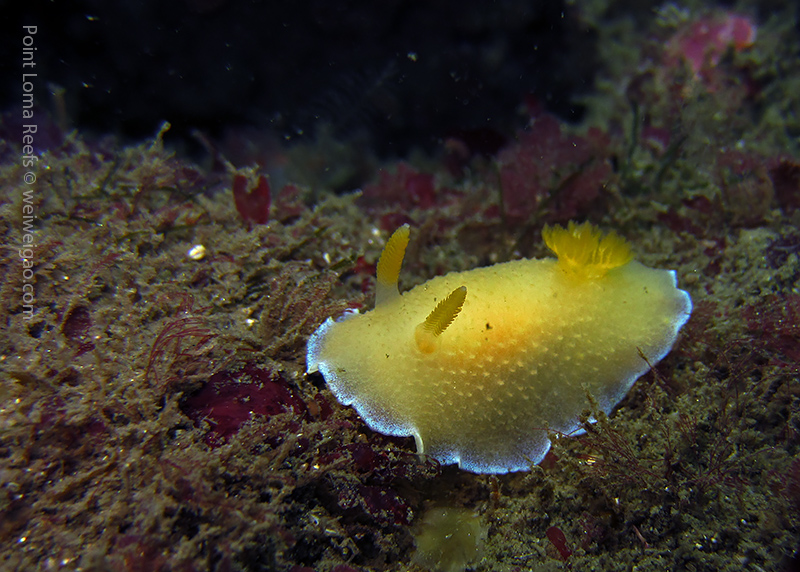 The highlight of the dive is to spot Doriopsilla spaldingi, a kind of nudibranch named after San Diego diver George E. Spalding, III. I have never seen this nudibranch before but today found three of them at Point Loma. They look just like the common yellow dorid but with a very distinctive neon blue line around the body.