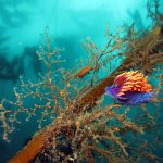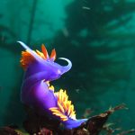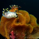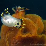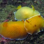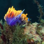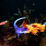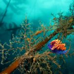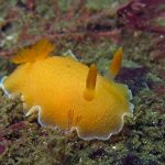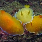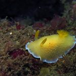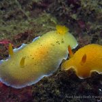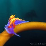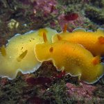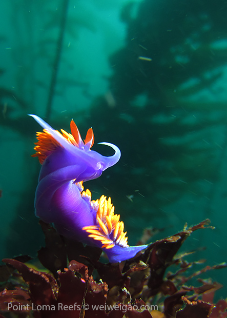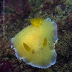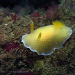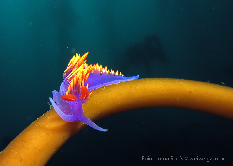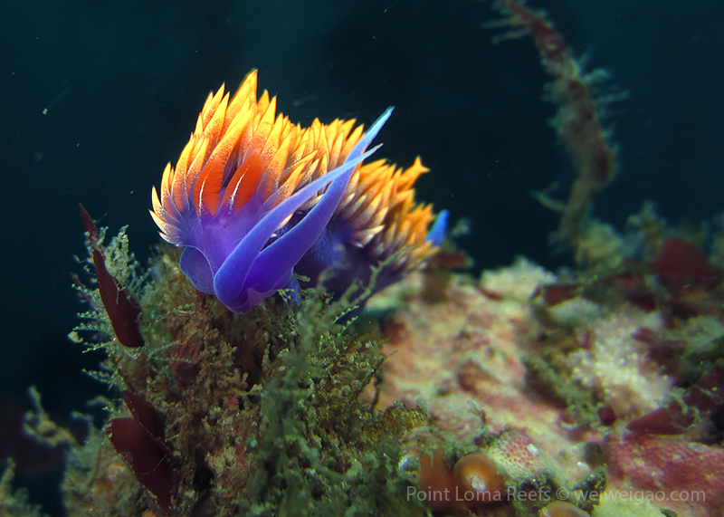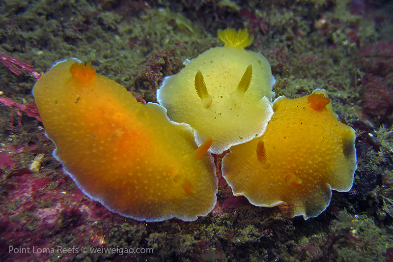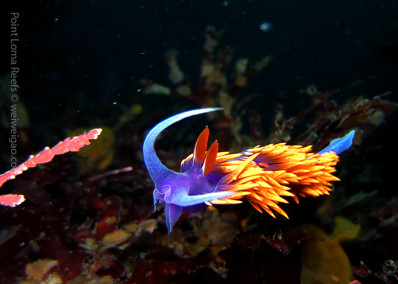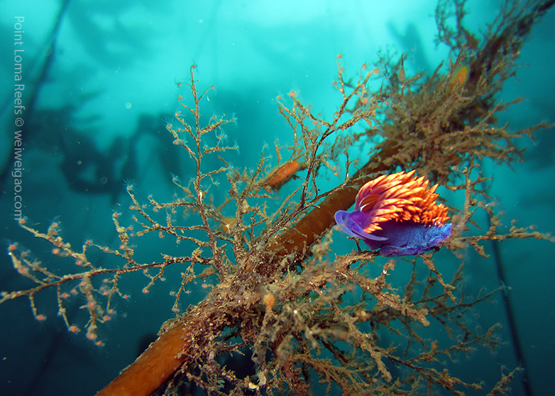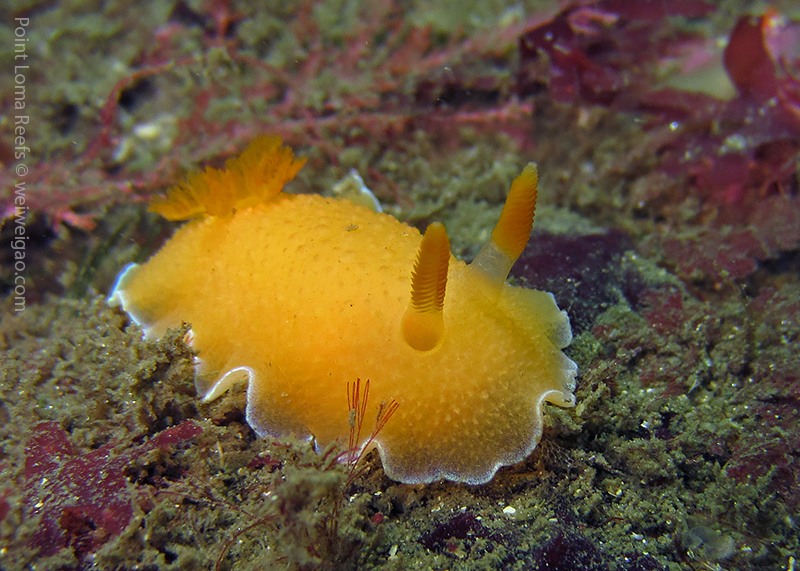 The highlight of the dive is to spot Doriopsilla spaldingi, a kind of nudibranch named after San Diego diver George E. Spalding, III. I have never seen this nudibranch before but today found three of them at Point Loma. They look just like the common yellow dorid but with a very distinctive neon blue line around the body.