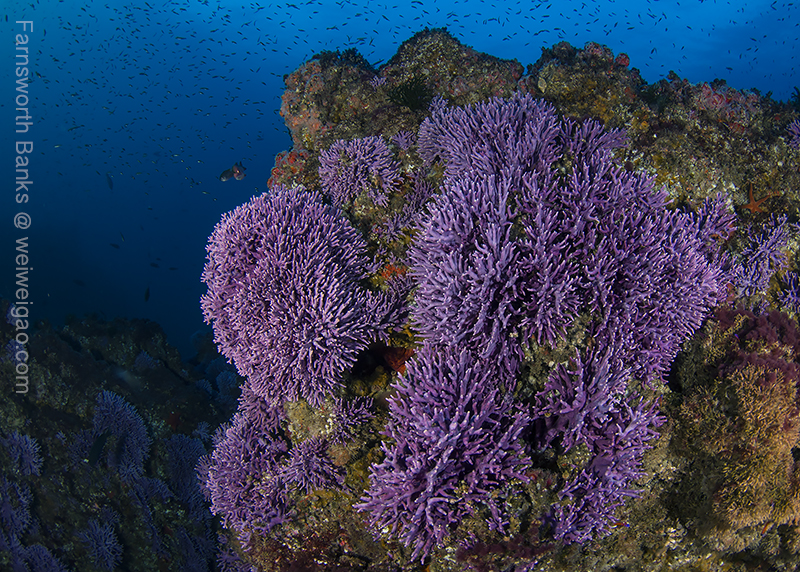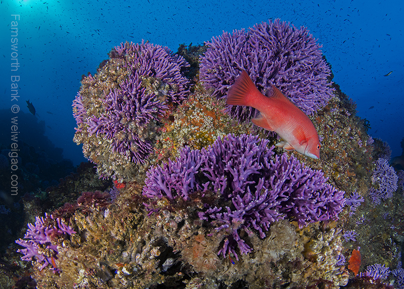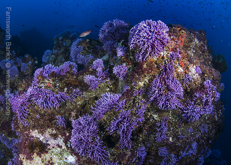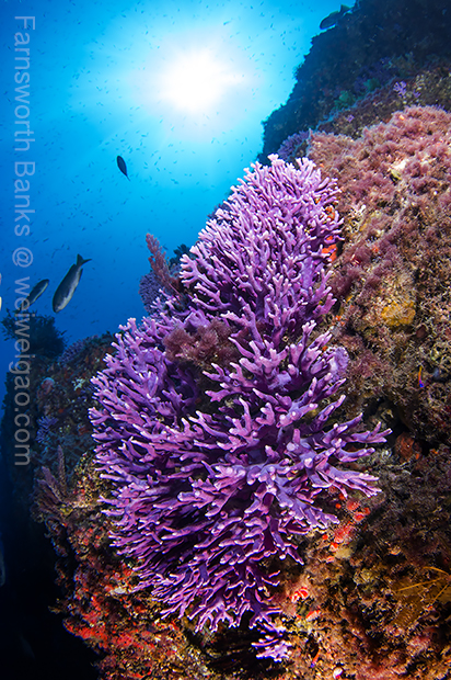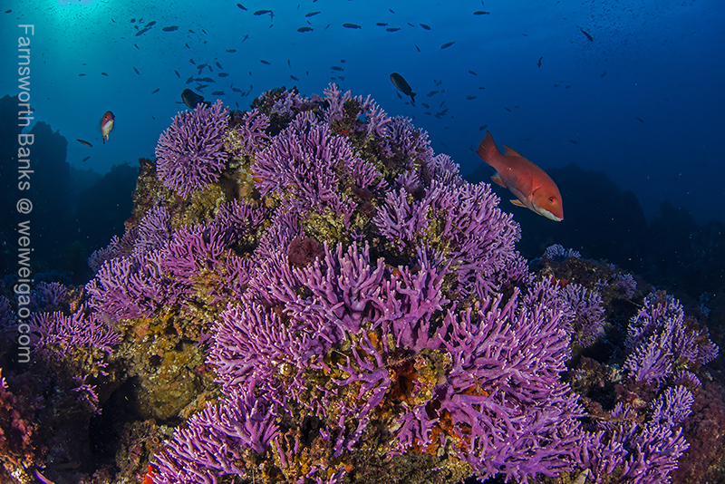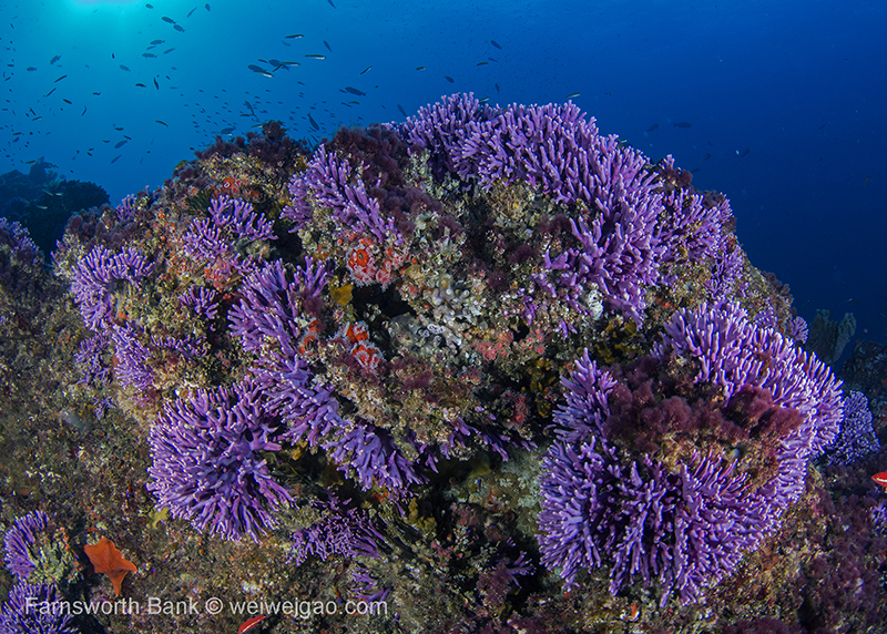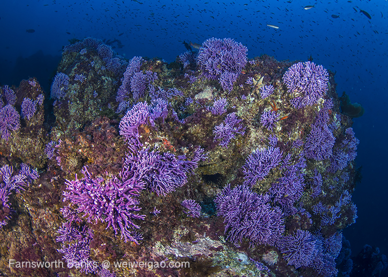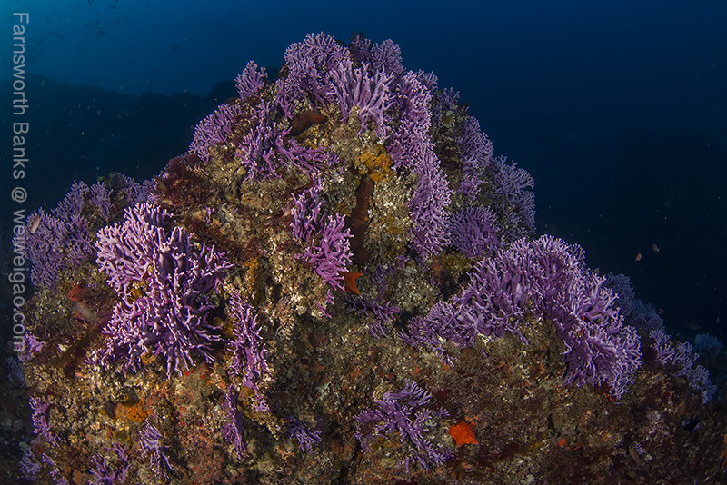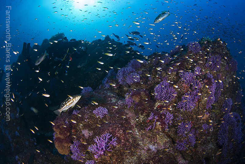 When I woke up in the morning, the boat was already anchored at Farnesworth Bank. The surface was flat and the water was clear. I was excited and the first to jump into the water. I could see the reef even from the surface. As soon as I dropped down, I was stunned by how beautiful it was. The purple hydrocoral was piled up and covered the whole area. From the very top of the plateau all the way to the deep canyon it was everywhere. The visibility was easily 100 ft. It was beautiful.