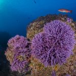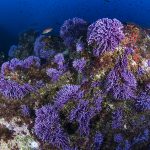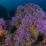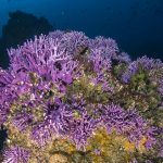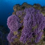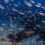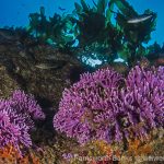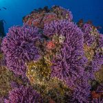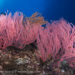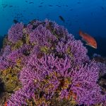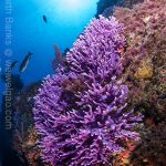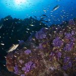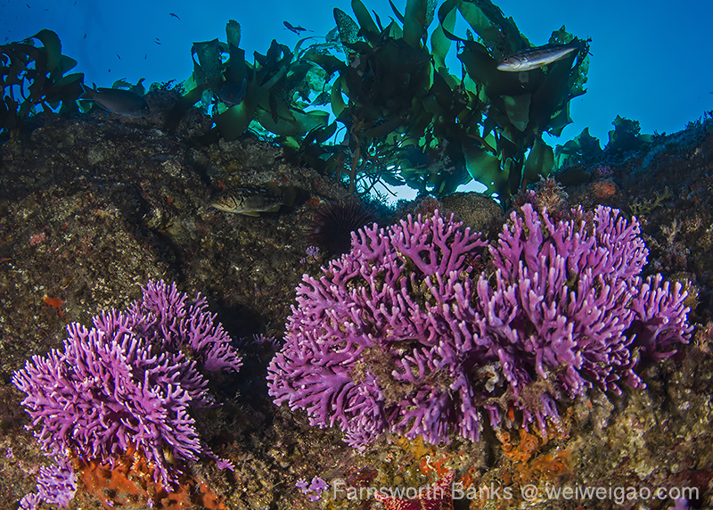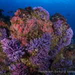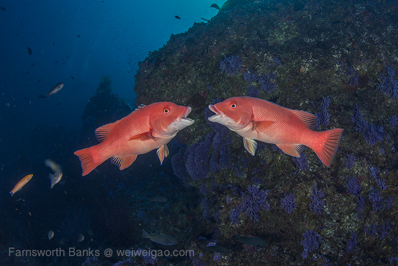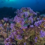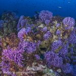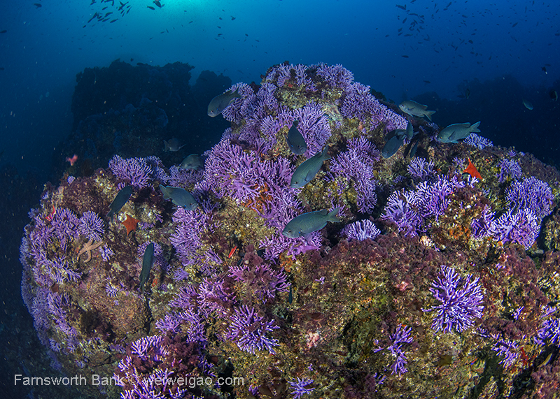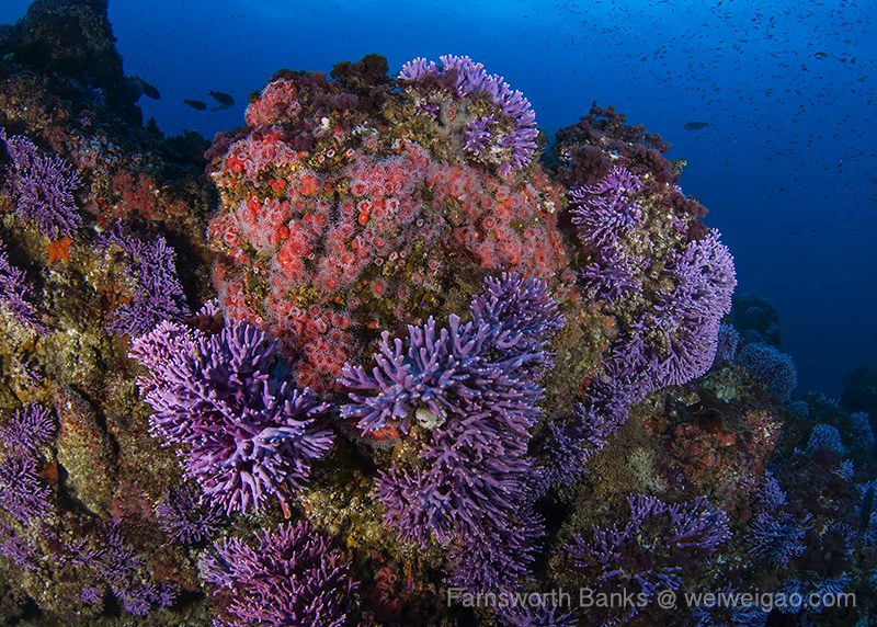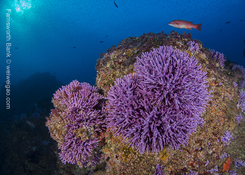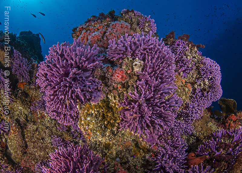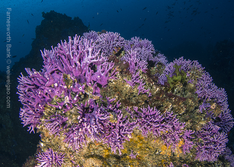 When I woke up in the morning, the boat was already anchored at Farnesworth Bank. The surface was flat and the water was clear. I was excited and the first to jump into the water. I could see the reef even from the surface. As soon as I dropped down, I was stunned by how beautiful it was. The purple hydrocoral was piled up and covered the whole area. From the very top of the plateau all the way to the deep canyon it was everywhere. The visibility was easily 100 ft. It was beautiful.