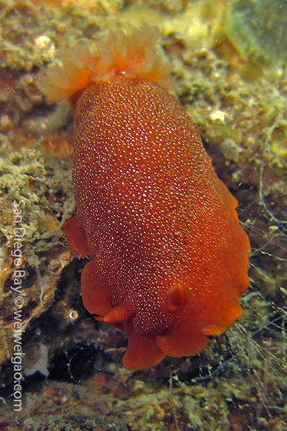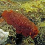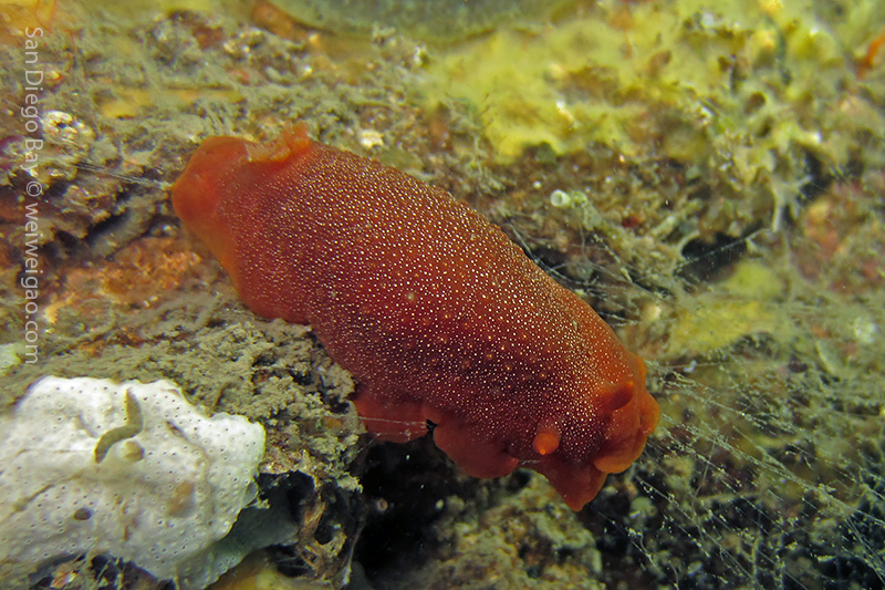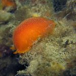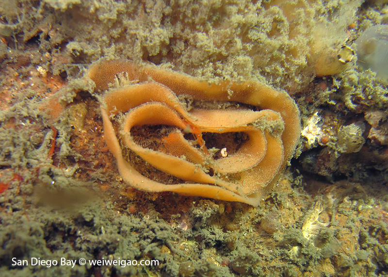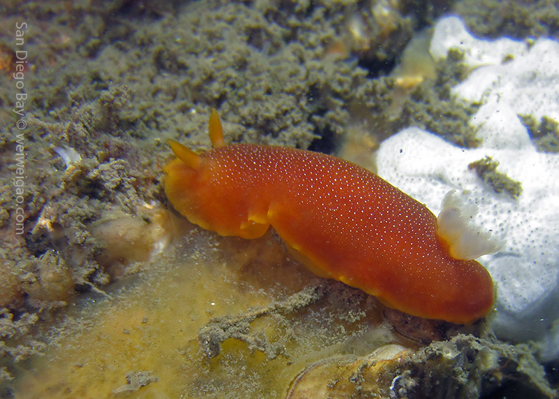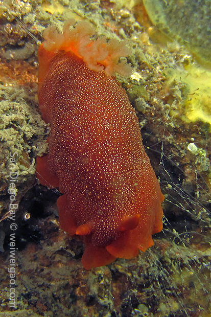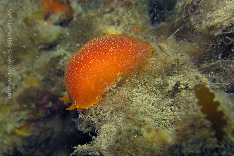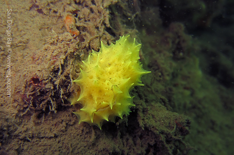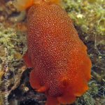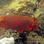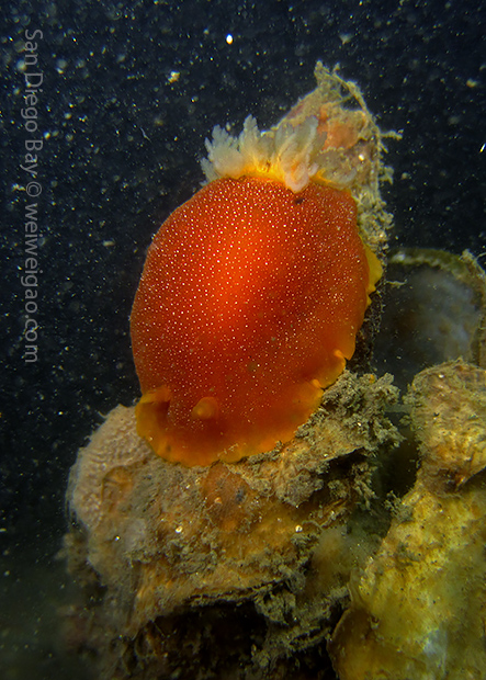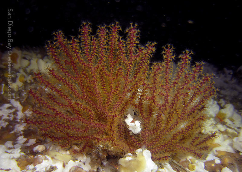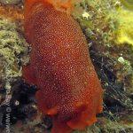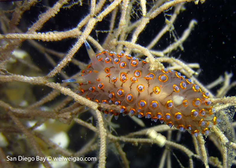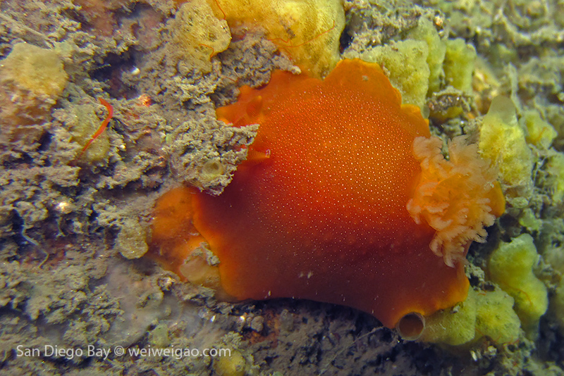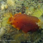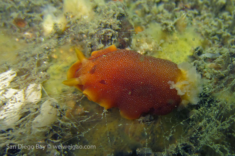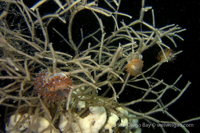 At the end of the pier, there was a big wall. It was the bottom part of the restaurant water front. To our surprise, the water here was much clear, allowing me to thoroughly check the creatures. We saw quite a lot of spotted dorids, but they came with crimson color, which made this kind of common sea slug interesting to watch. I also noticed that they, unlike the same nudibranchs but with other colors, didn’t retreat their gills upon my approaching, making them a cooperative subject for pictures.