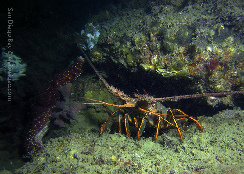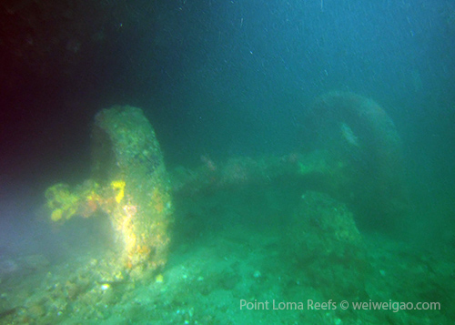 After the clean-up, I joined Steve and Mike W. for a one dive at the Train Wheels. This is my first time to dive this famous site at Point Loma Reefs. It was toward the south so we launched the boat from Shelter Island. At the site, after we dropped down, the visibility was not that great and the water was very surgy. I followed Steve to the train wheels. There are in total two pairs of them, stuck inside a big deep crack. What is remarkable about this site is that nobody is certain how the wheels were placed inside the crack in the first place. I checked out the wheels, then swam up and through the crack.