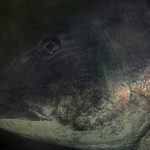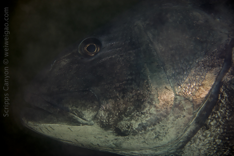 I was cruising along the canyon, in and out of the notches, and suddenly I came across this giant sea bass resting in a narrow notch. We were face to face and there was no exit on the side. I stayed quiet and the fish was calm, slowing swimming by me and disappeared into the dark green. Then I turned and after a few kicks here it was again, resting next to a crevice. This time the fish didn’t swim away. I was with my macro lens and not much I could do to get a nice shot. Instead, I was just watching it. We stared at each other for quite a while. What an experience.