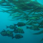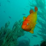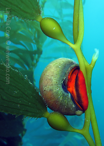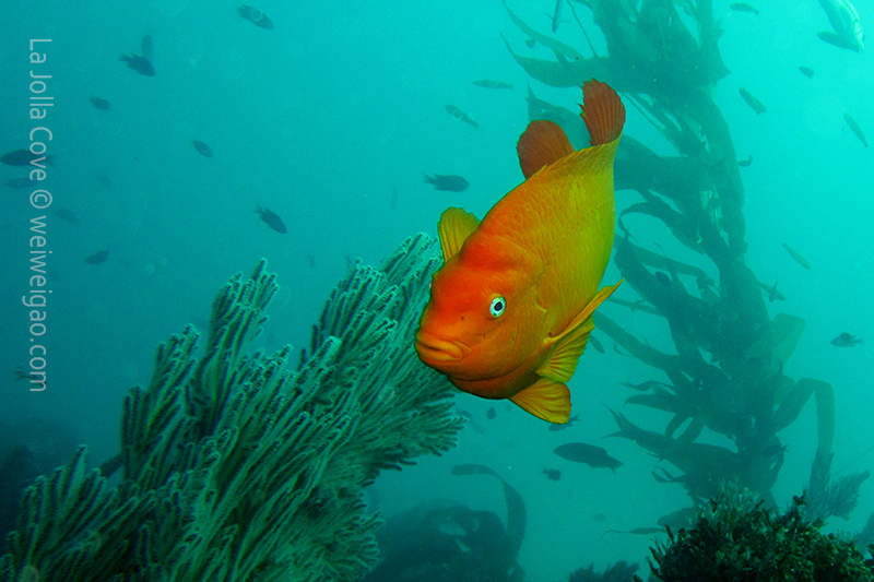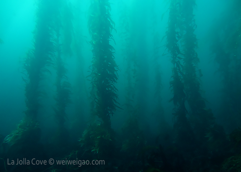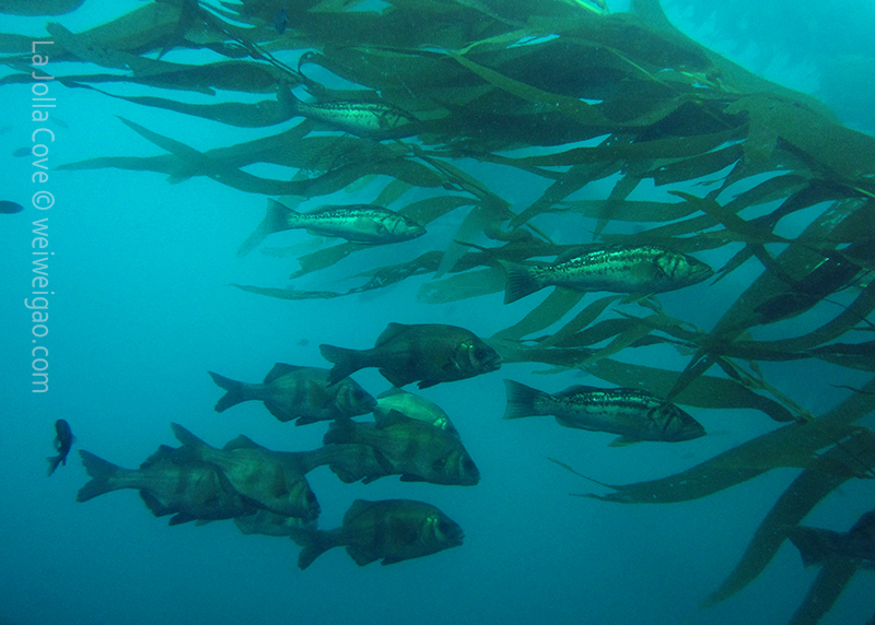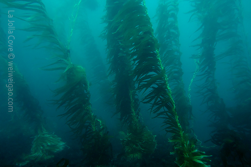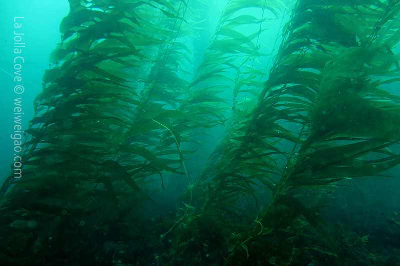 I then kicked toward the south but didn’t see any more sharks. Bright sunshine and many particulates in the water were challenges for my camera. Enjoyed the giant kelp that the cove offered.
