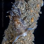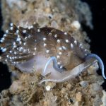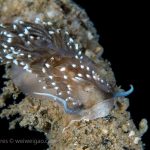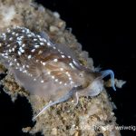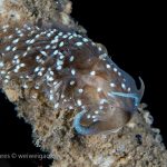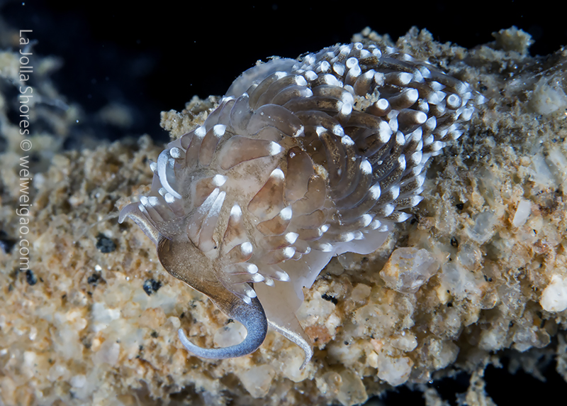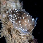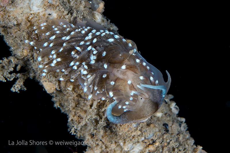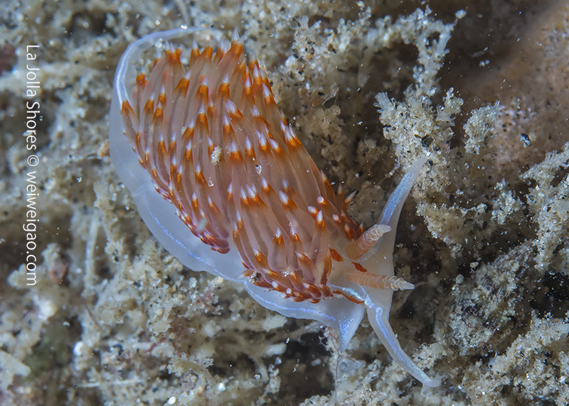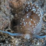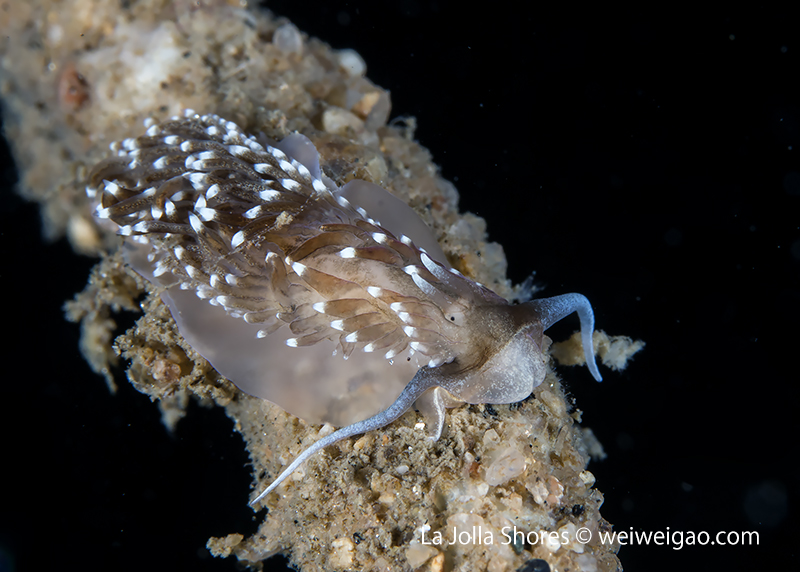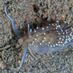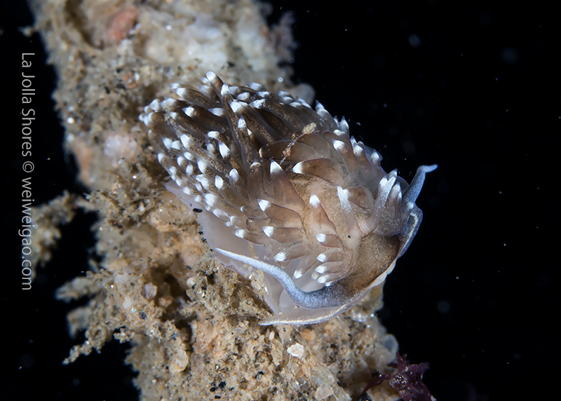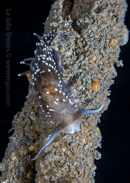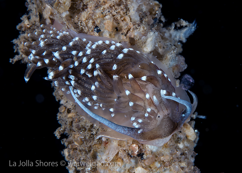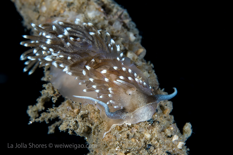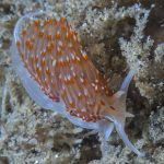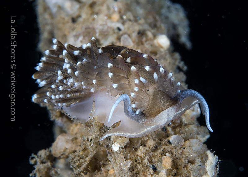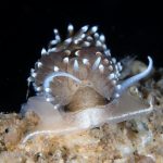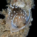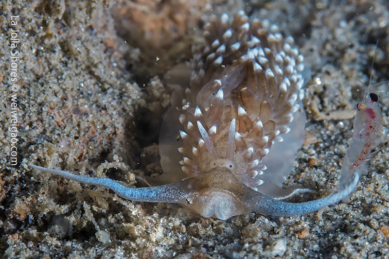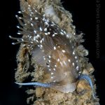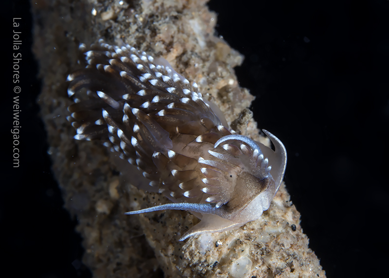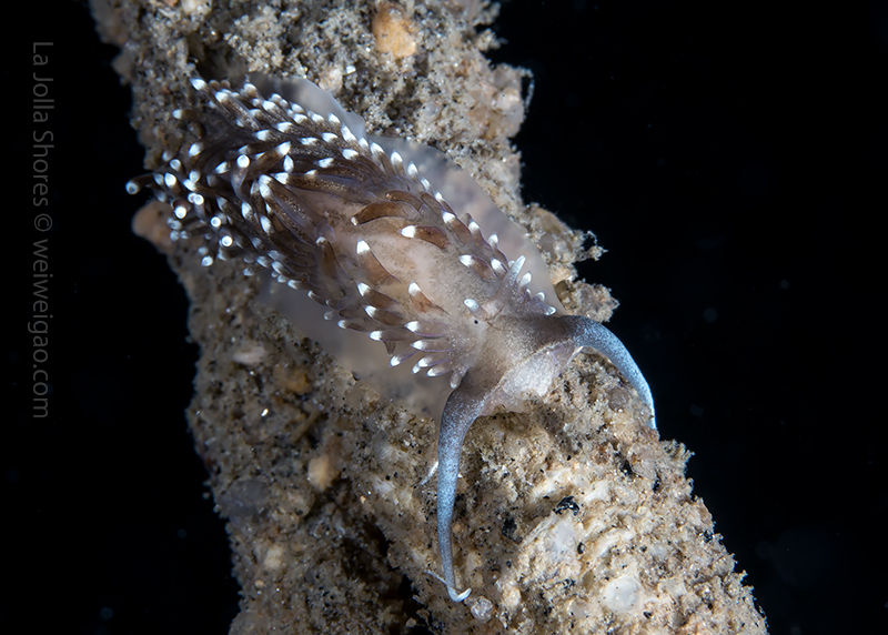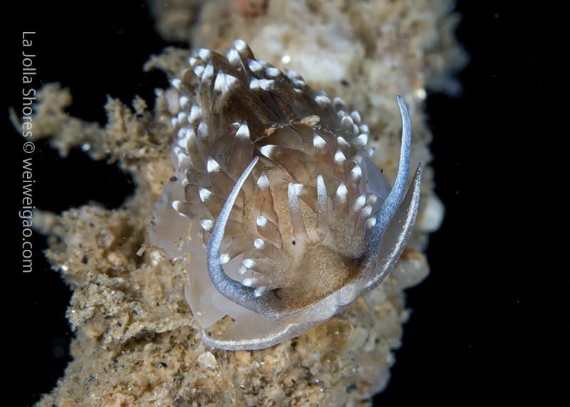 Under the dive light it had a blue hue. On my way back, I thought it was some variations of a Stearn’s Aeolid, but the rhinophores are different. Turned out it was a Cerberilla pungoarena.