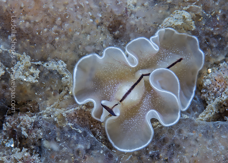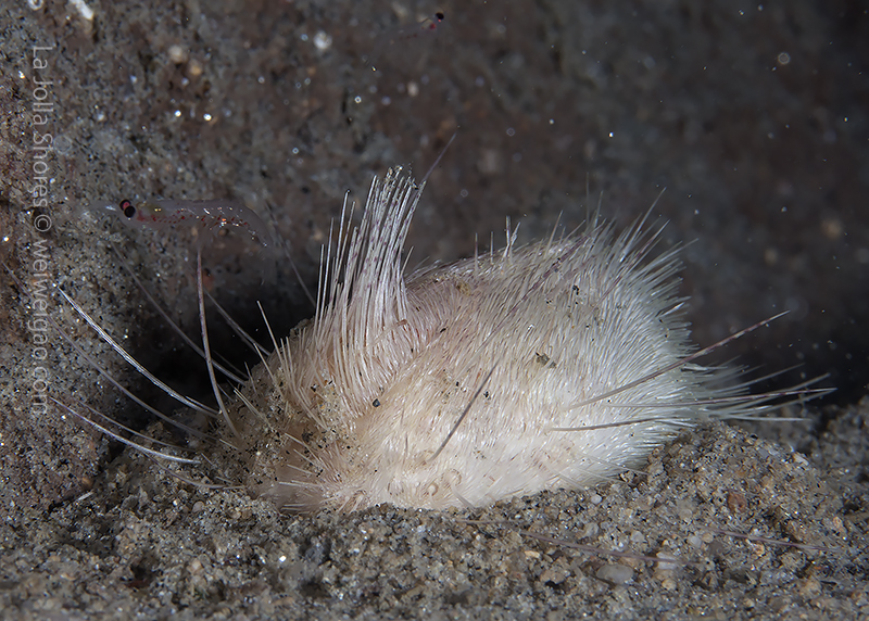 Highlight critters were the 1 Pleurobranch foraging like mad, several Heart Urchins who can’t bury themselves fast enough at the sight of light, and the clump of Squid Eggs swaying in the breeze. Hardly any fish were out or even seen sleeping. In the shallows the usual critters. A great dive.