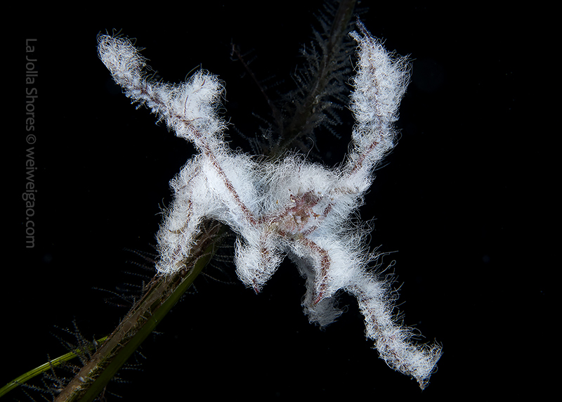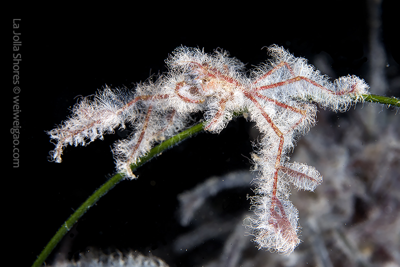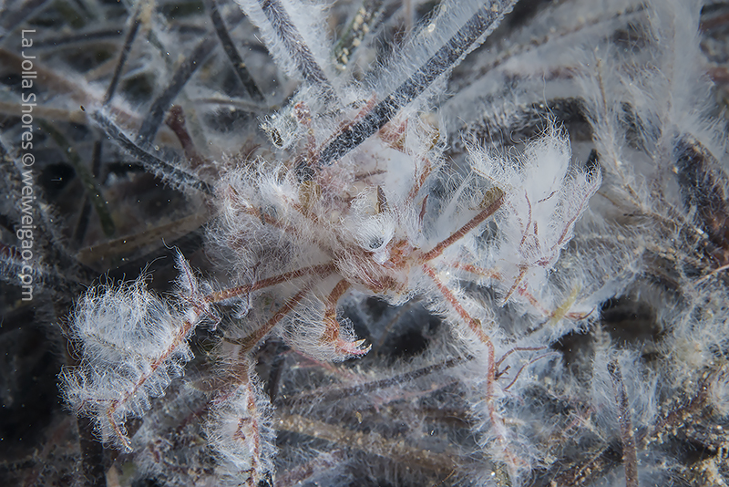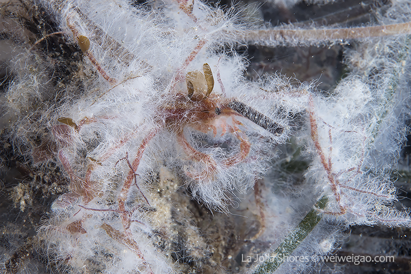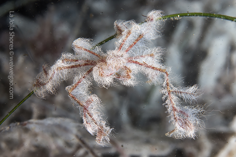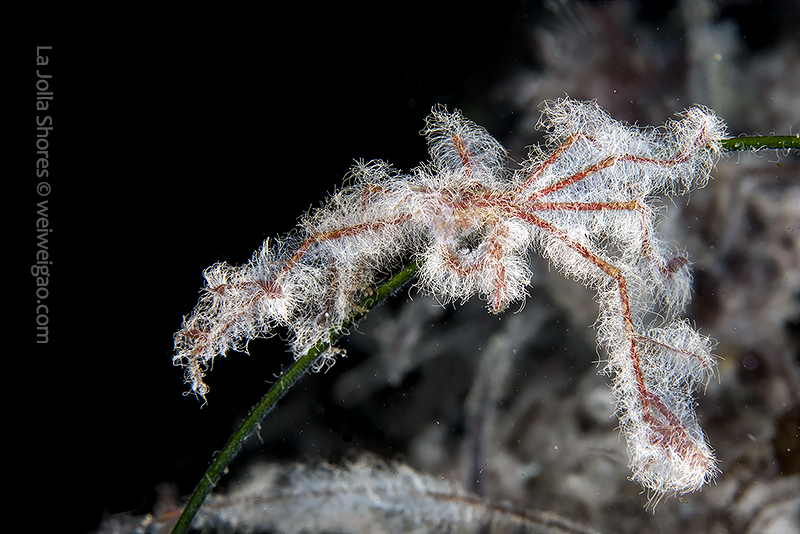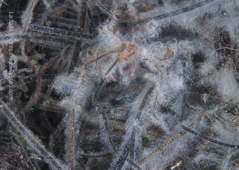 Decorator crabs (Hemphill’s Kelp Crab, Podochela hemphilli) find materials in the environment to decorate them for camouflage. Their bodies appear a dark brown color and feature long and thin legs, which together allow them to blend perfectly with branching reddish seaweed such as Prionitis lyallii or Plocamium cartilagineum. To make such nearly perfect camouflage even more disguising, these crabs decorate their bodies with small pieces of kelp. These tiny fragments of the kelp are attached by the edges to the crab’s shell. Each piece stands up, making the whole outfit look like the armor of an ancient worrier. Cool, but common. Because of their common presence, these crabs seldom catch much of my attention.
