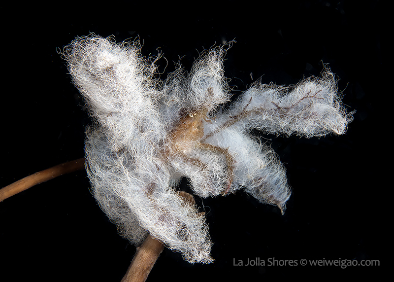 Wearing this outfit, the crabs blend perfectly with the alga-covered landscape. To find them, one needs to squint hard. From far, the coat is thick and furry, transforming the crab into a wonder creature: their snowy white color reminds me the fur of a polar bear, the swinging hairs on the arms remind me orangutans in the jungle, the waving arms raised high up remind me a slow-moving sloth, and their playful movements remind me cute panda babies. A close observation reveals bundles of filaments, arranged in perfect order. Each filament appears smooth and shinning, like angel’s hair symbolizing heavenly purity.