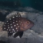 In the past week, this juvenile star-studded grouper, a warm water visitor at the shores, really caught my attention. With the warm help from Jackie, I was able to easily locate the fish. The newly formed canyon wall made a perfect stage for observing and photographing. I first learned that the fish was shy and skittish at night and then decided to visit during daylight. What a marvelous creature – its dark brown color, contrasting the dull background of the wall, tells a character unwilling to blend with ordinary. Rows of bright spots are on top, perfectly lined up, shadowing other small fish nearby.