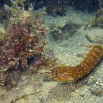 While I was going to turn back to the shores, I spotted a mantis shrimp, the same yellow kind as I saw before. It was constantly moving, making it difficult to take pictures. It seemed like the shrimp was looking for a new home as it was trying to dig the sand.
