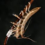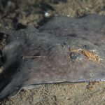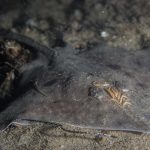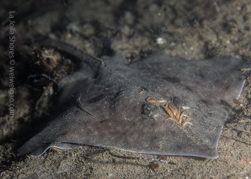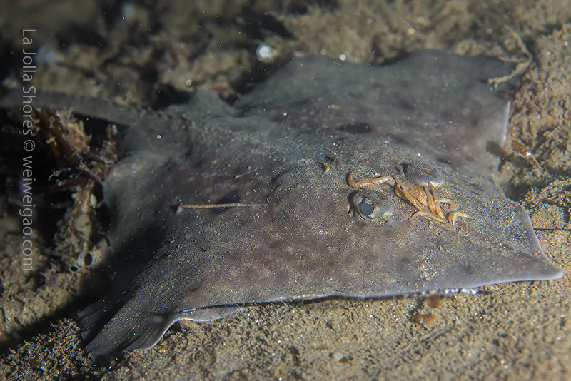 Highlight critter was a baby Skate (I’m pretty sure), with beautiful markings. Sadly there were some parasites attached to its head. Also, a brief sighting of a Mantis Shrimp foraging, then disappearing into a hole.