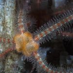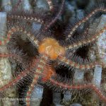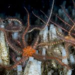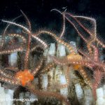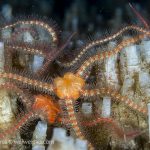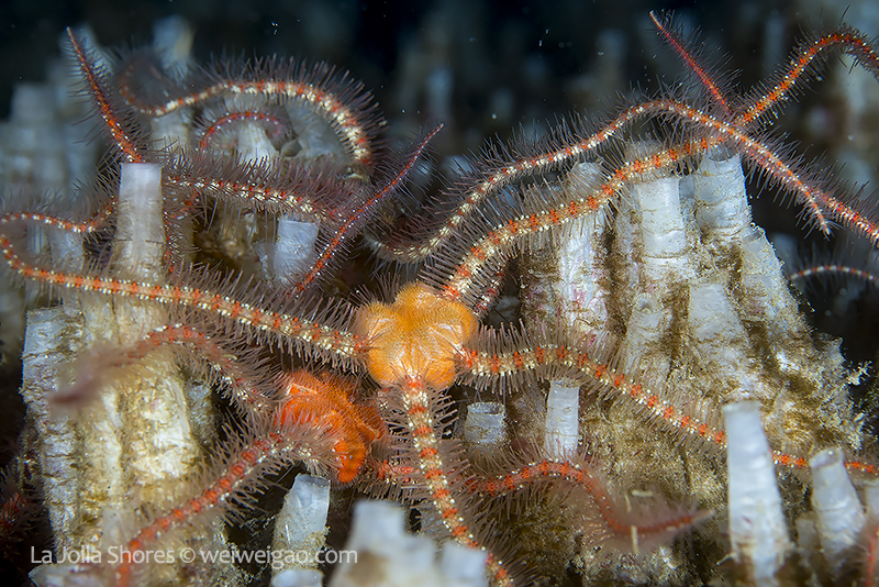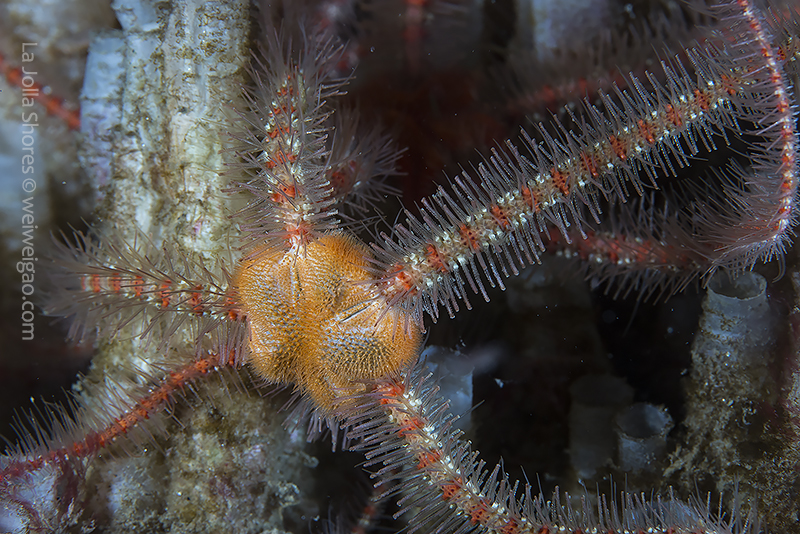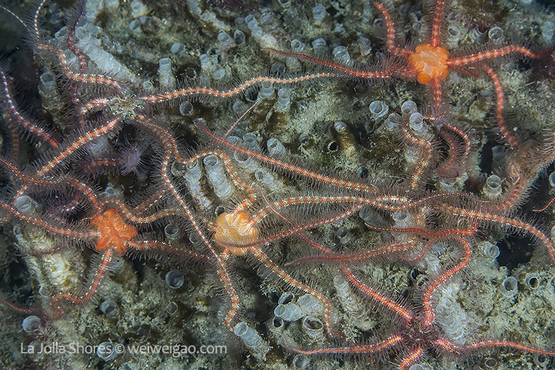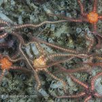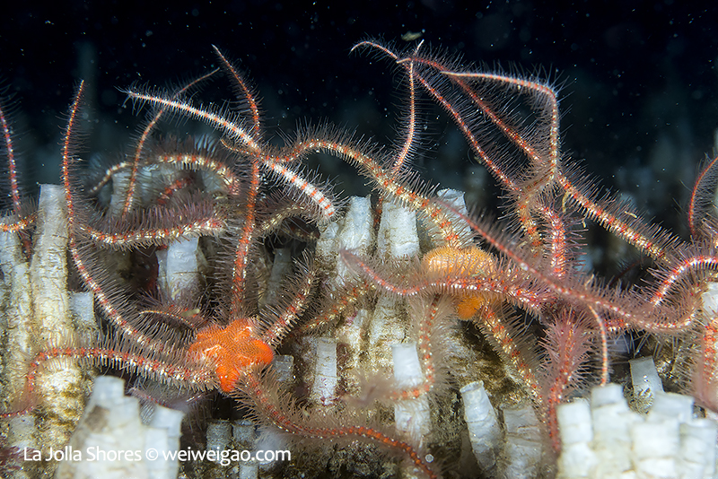 Headed out to the shores for a night dive. Again, this time I dropped down on the north, hoping to see the Dendronotus iris again. But to my surprise the visibility dropped significantly. The water was sweeping along the slope of the canyon, stirring up lots of the sediments. The most part of the dive was rather uneventful. When I got closer to the V point, I started to see more and more brittle starfish.